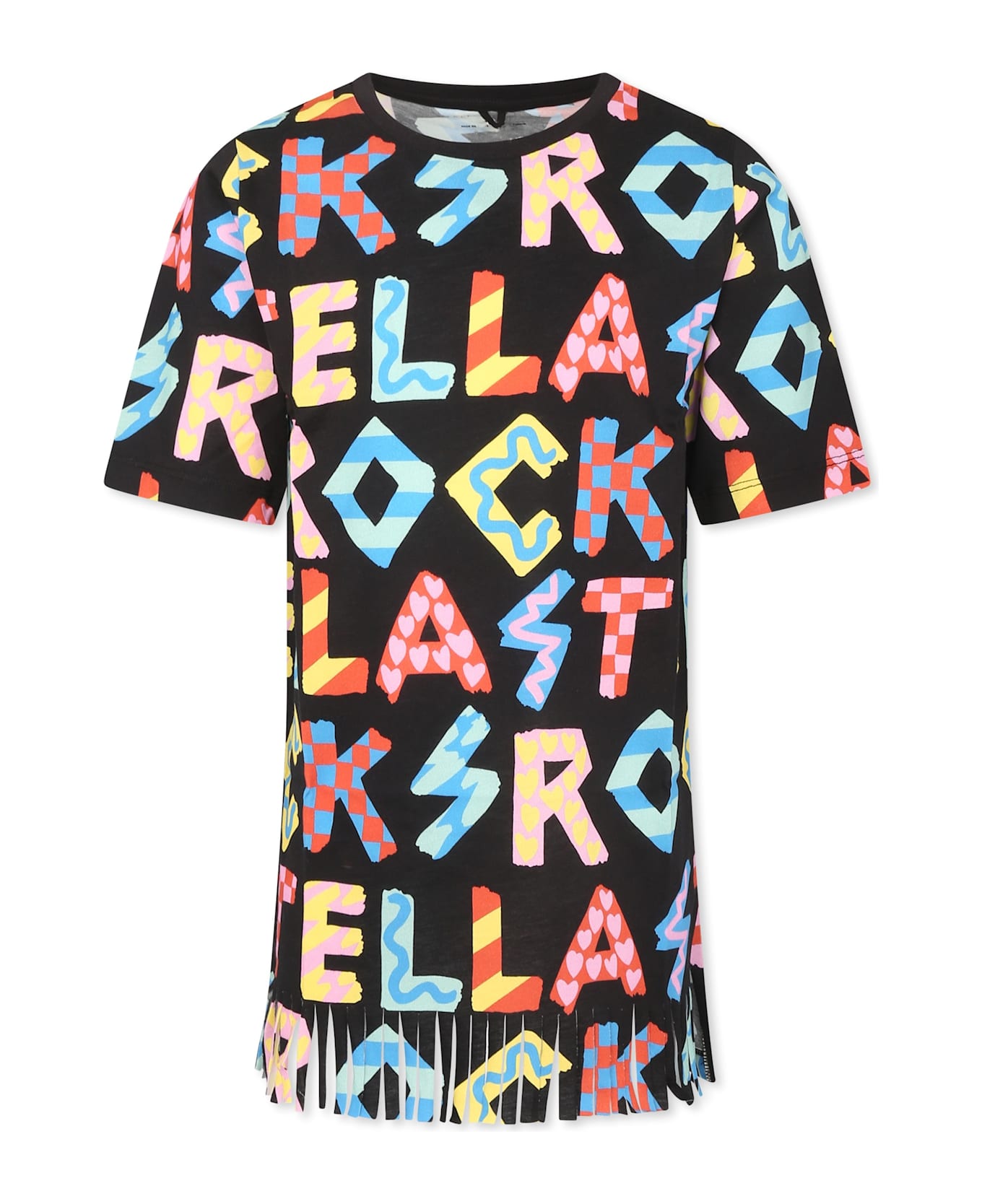 Black dress in GOTS certified organic cotton, short sleeves, with a cotton crew neck and fringed hem. It is embellished with an all-over multicolor logo.