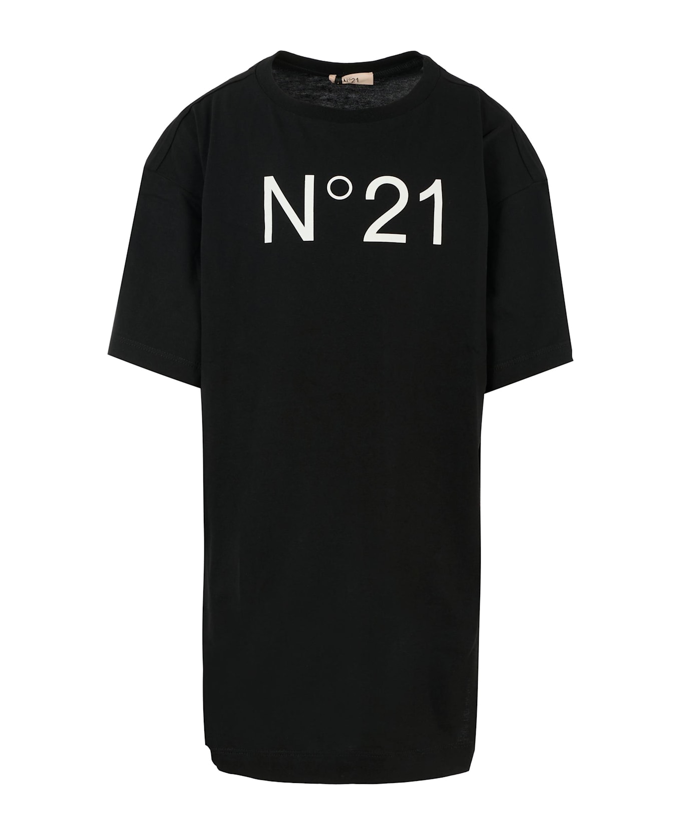 Black cotton dress with short sleeves, a ribbed crew neck, and side slits at the bottom. It is embellished with a white logo print on the front.
