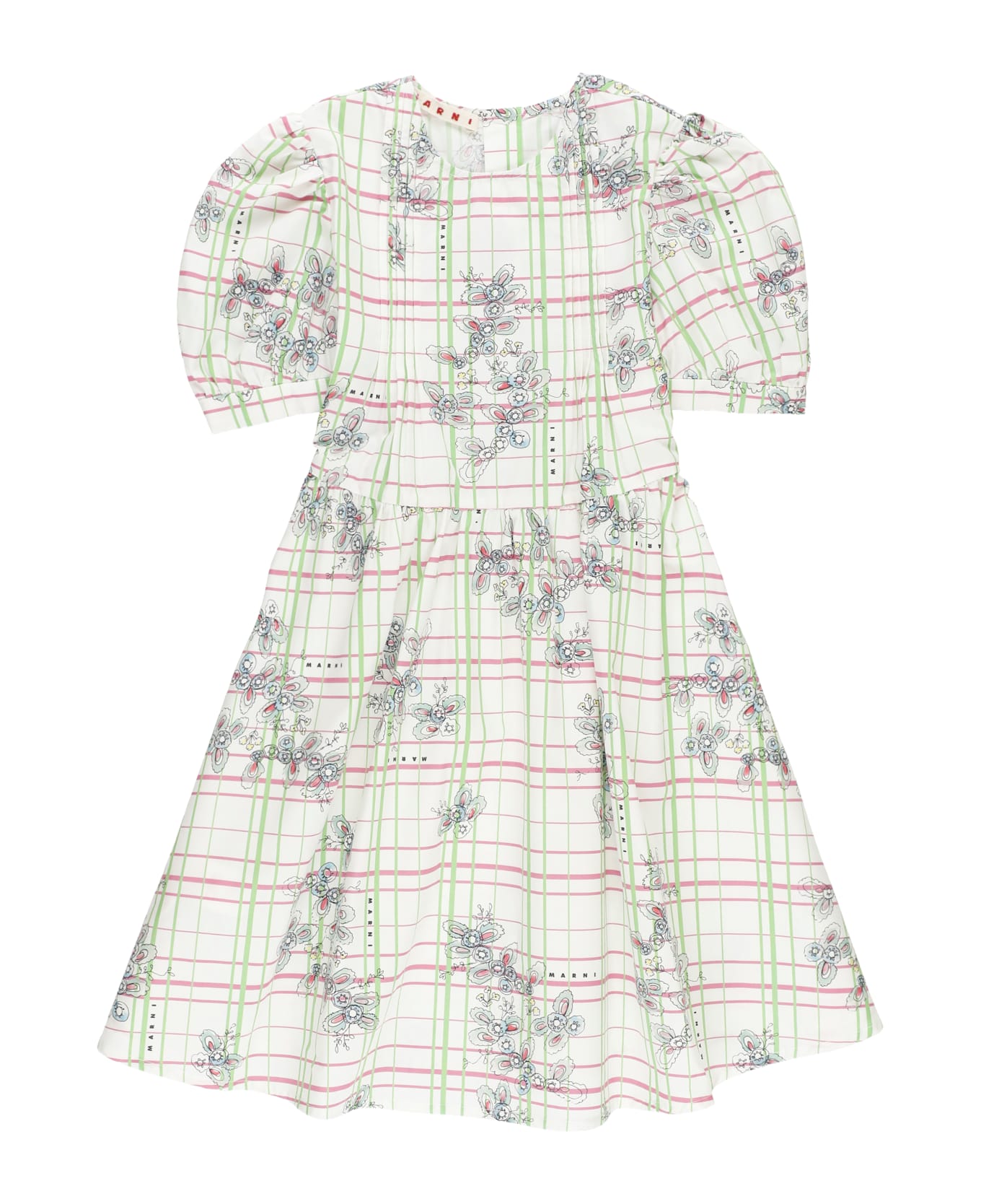 - White Marni Kids cotton dress for girl - Crew neck - Short sleeves - All-over contrasting color pattern with logo - Rear buttons fastening Composition: 100% Cotton