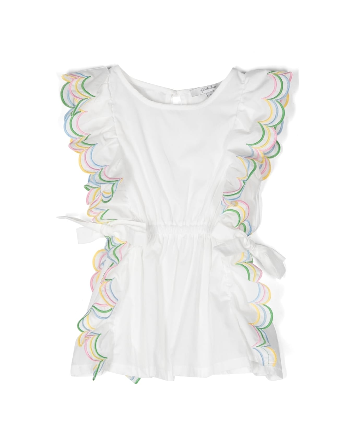 White/Multicolor, cotton, embroidered design, scalloped hem, scoop neckline, keyhole back, back button closure, sleeveless, drawstring waist and bow detail. Origin: Italy Composition 100% Cotton