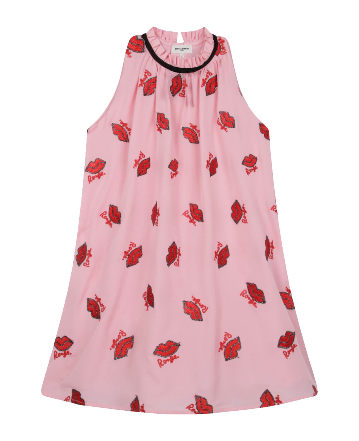lips motif print sleeveless dress from SONIA RYKIEL ENFANT featuring all-over graphic print, lips motif, sleeveless, frilled neckline, bow detailing, logo plaque, rear zip fastening, straight hem and blush pink/multicolor.