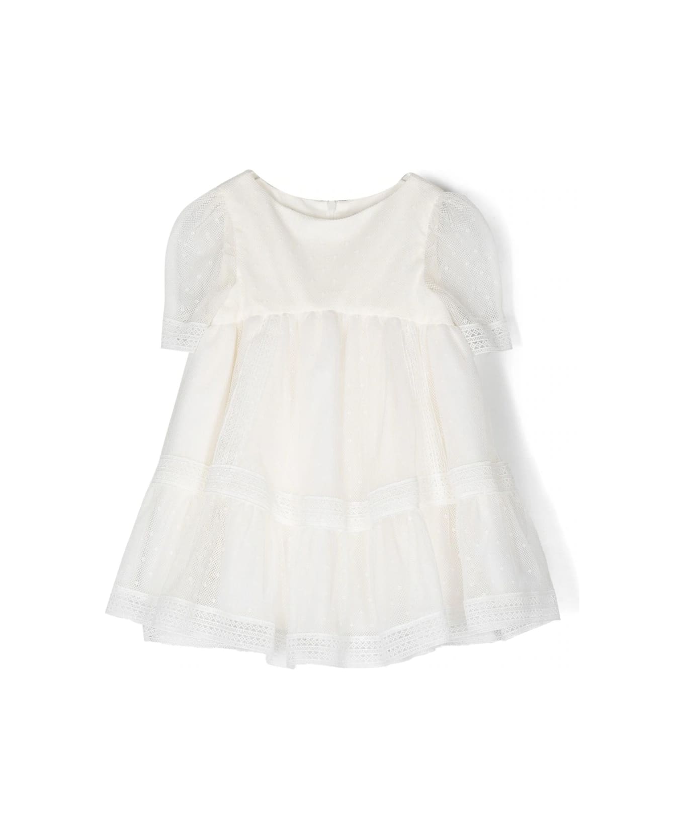 Ecru-coloured dress with airy volume by Tartine Et Chocolat made of gathered tulle and Swiss polka dot fabric and featuring a round neckline, short sleeves and lace details.