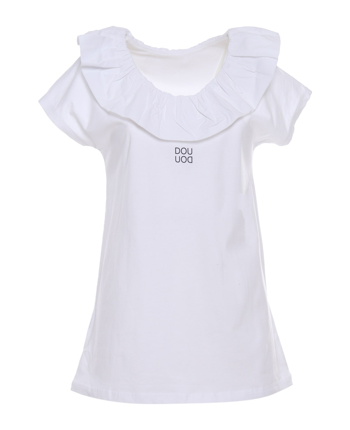 Cotton dress, flounce neckline, short sleeves, front logo print