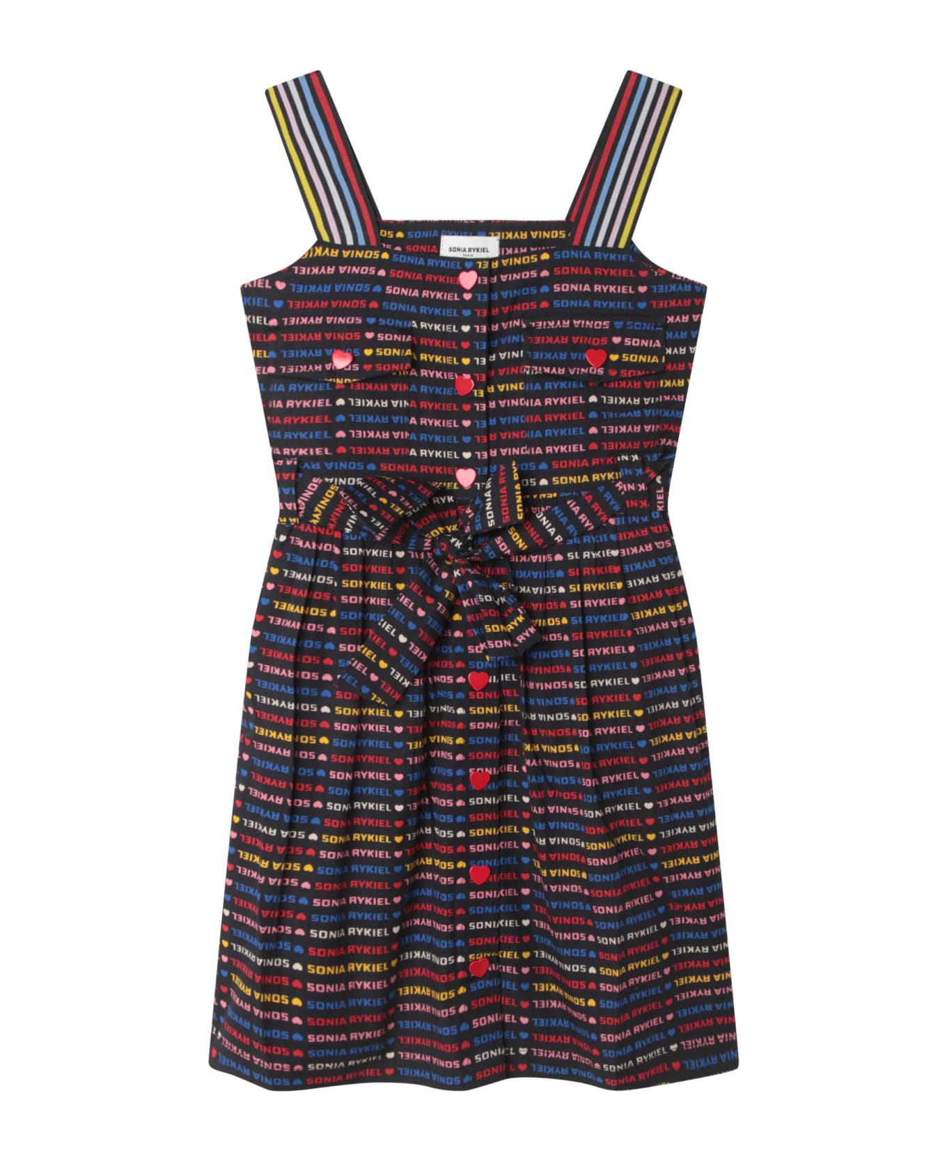 logo-print belted dress from SONIA RYKIEL ENFANT featuring black/multicolour, cotton, all-over logo print, front button fastening, heart-shaped buttons, belted waist, belt loops and straight hem.