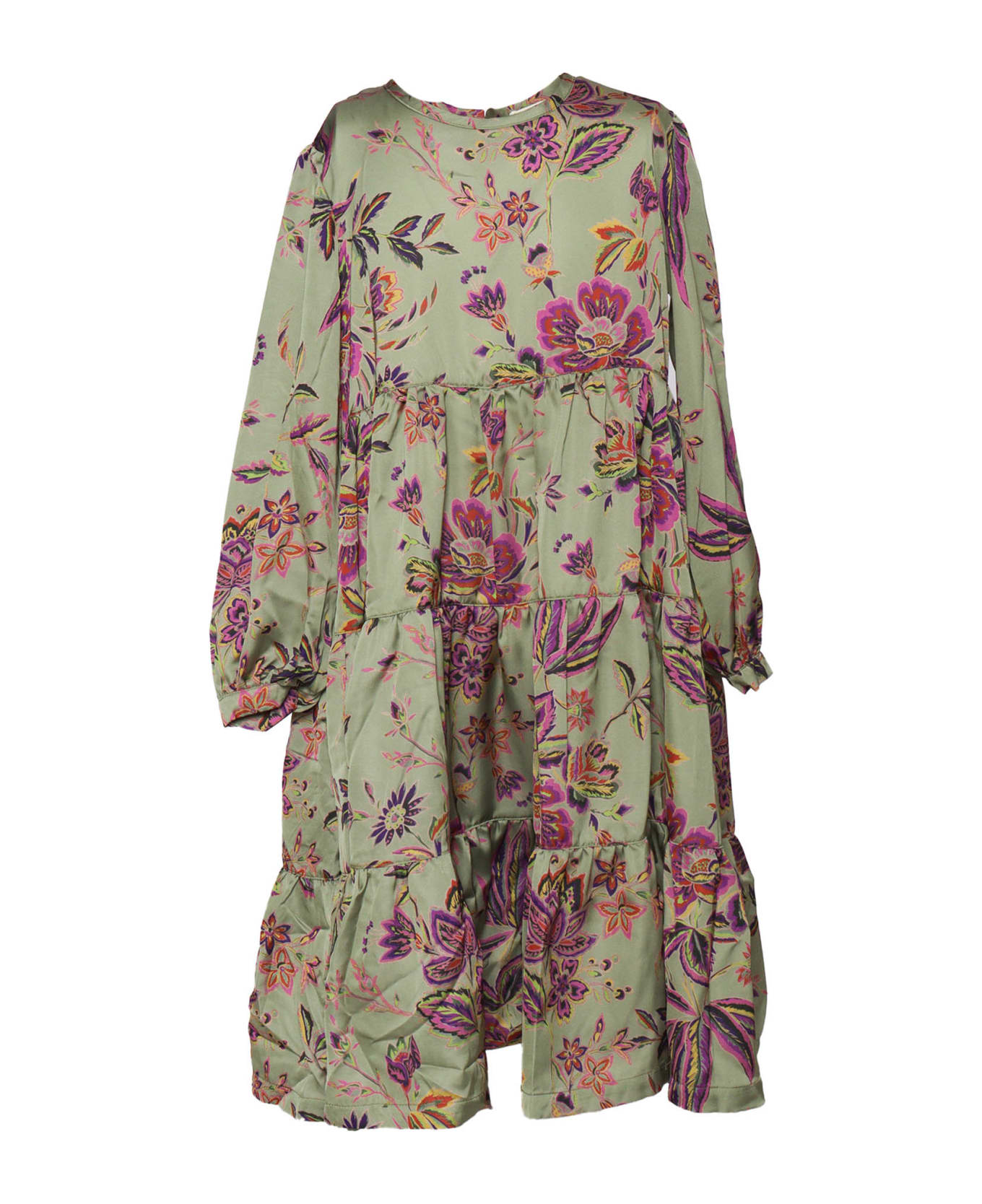 Floral dress, round neckline, long sleeves, buttoned cuffs, button fastening on the back