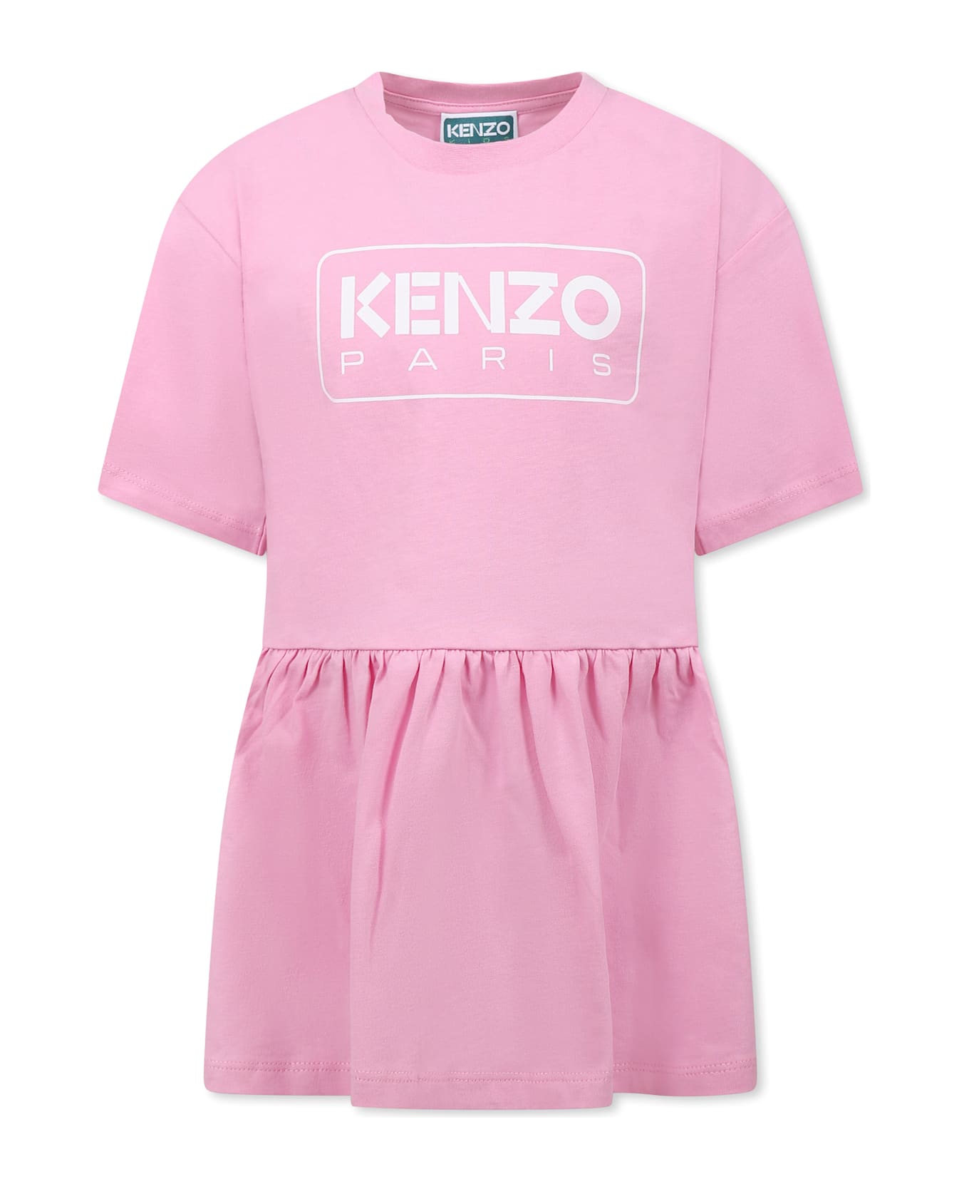 Pink dress in organic cotton, short sleeves, with a ribbed crew neck and flounce at the bottom. It is embellished with logo printed on the front.