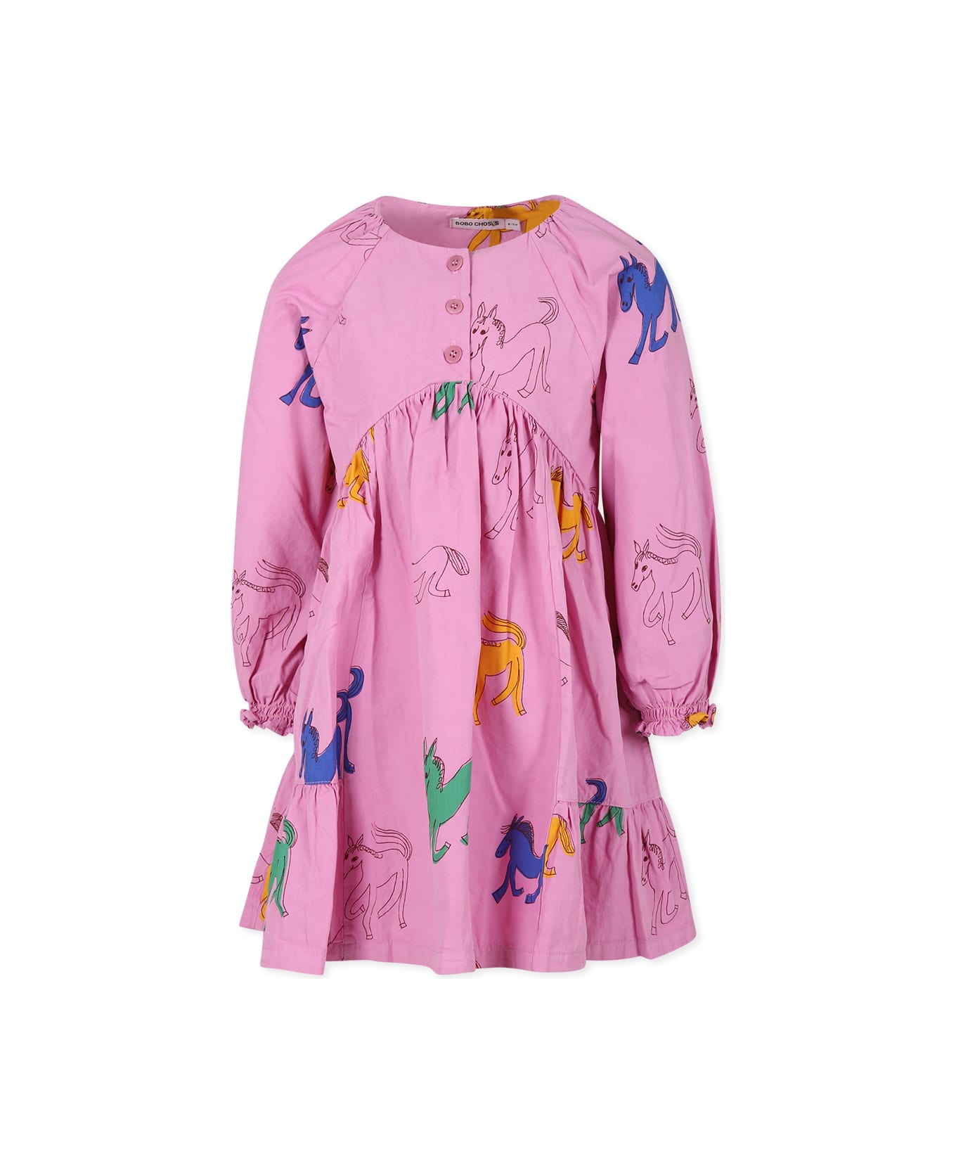 Pink dress in organic cotton, long sleeves, round neckline, front button closure, elasticated cuffs and flounce on the back. It is embellished with all-over horse print.