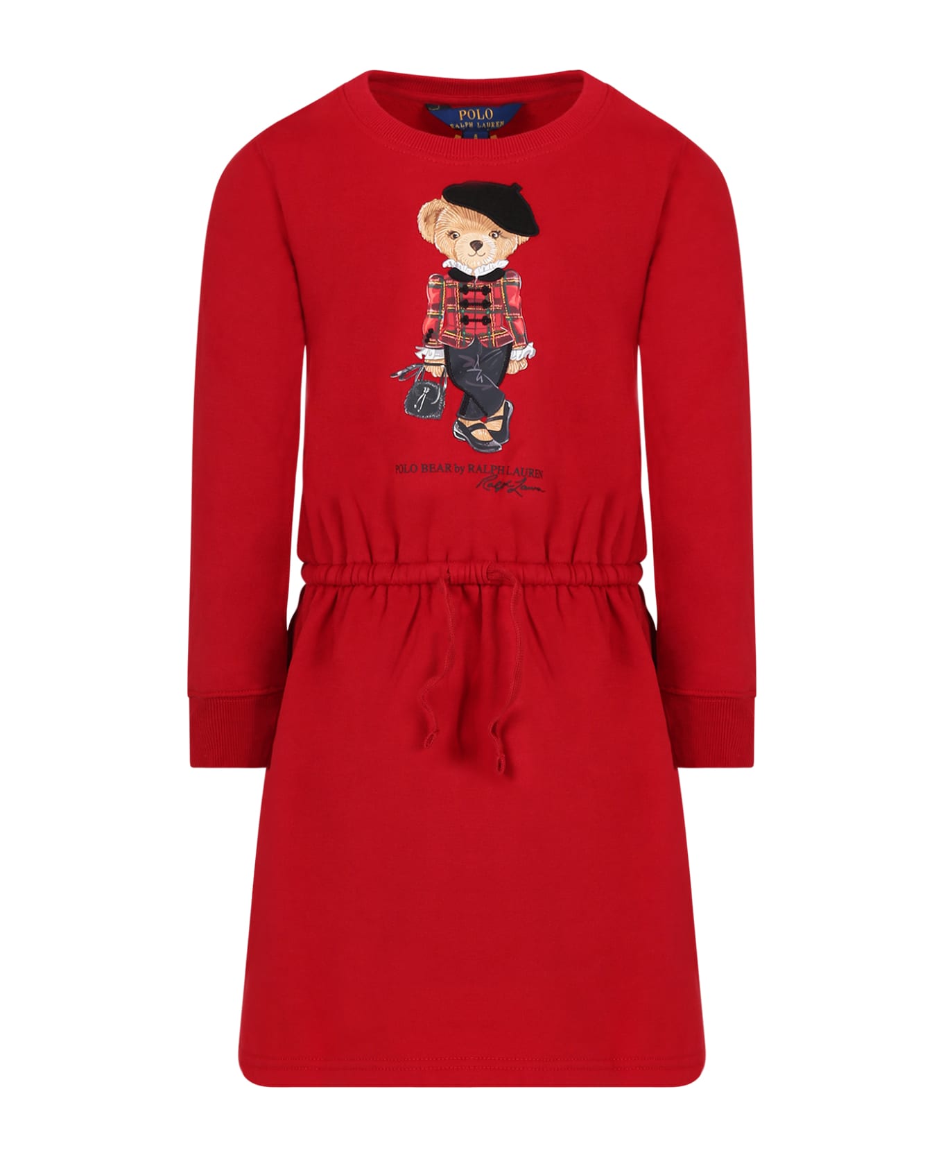Red dress in cotton fleece, with long sleeves, crew neck, ribbed cuffs, elasticated waist, drawstring and side pockets. He is embellished with bear, embroidered details and logo, on the front.