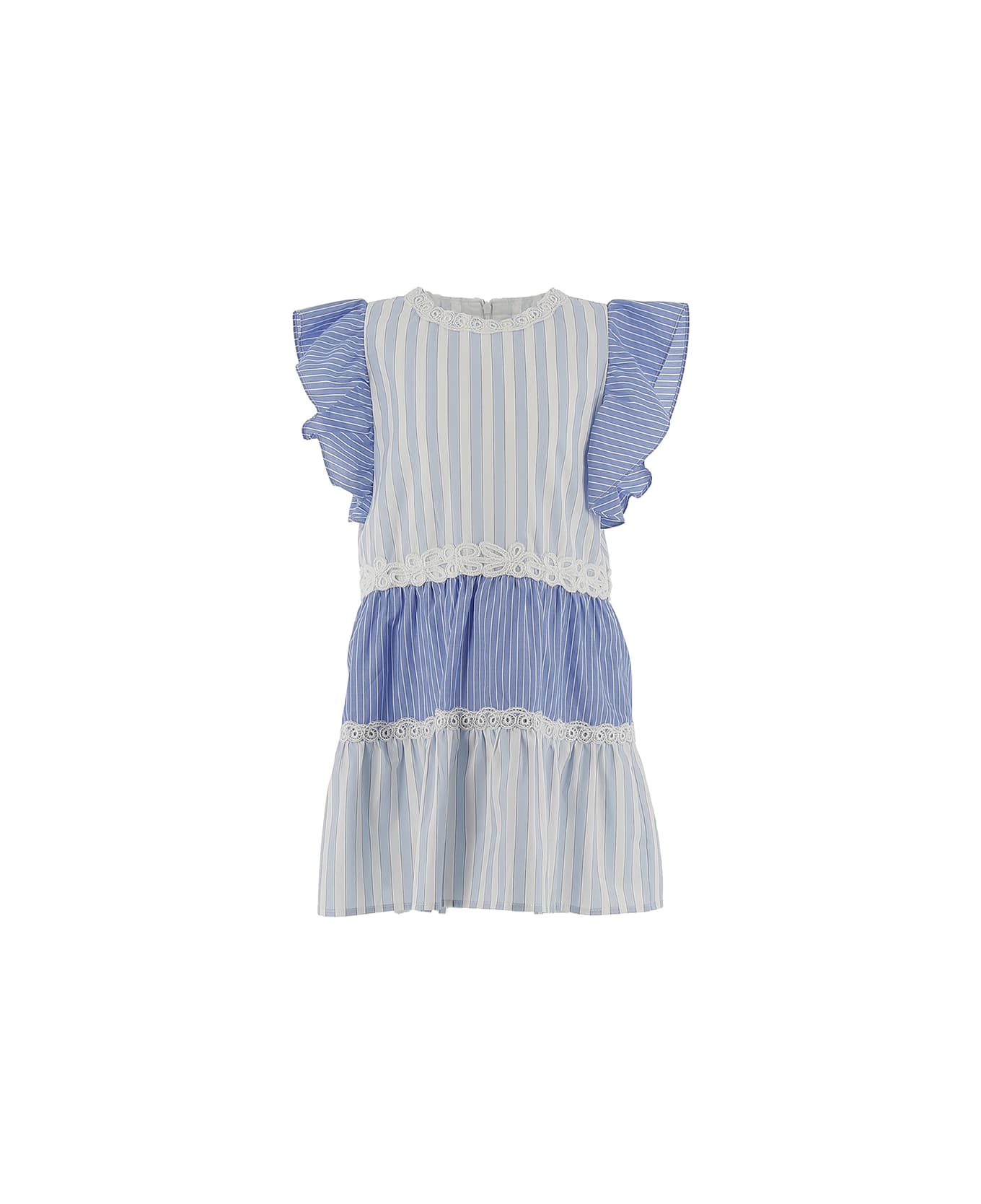 White and light blue sleeveless dress by Ermanno Scervino Junior in cotton with a vertical striped pattern, ruffles at the armholes and white lace details. The garment features a straight cut, a flared design, a round neckline, a panelled construction and a concealed rear zip fastening.