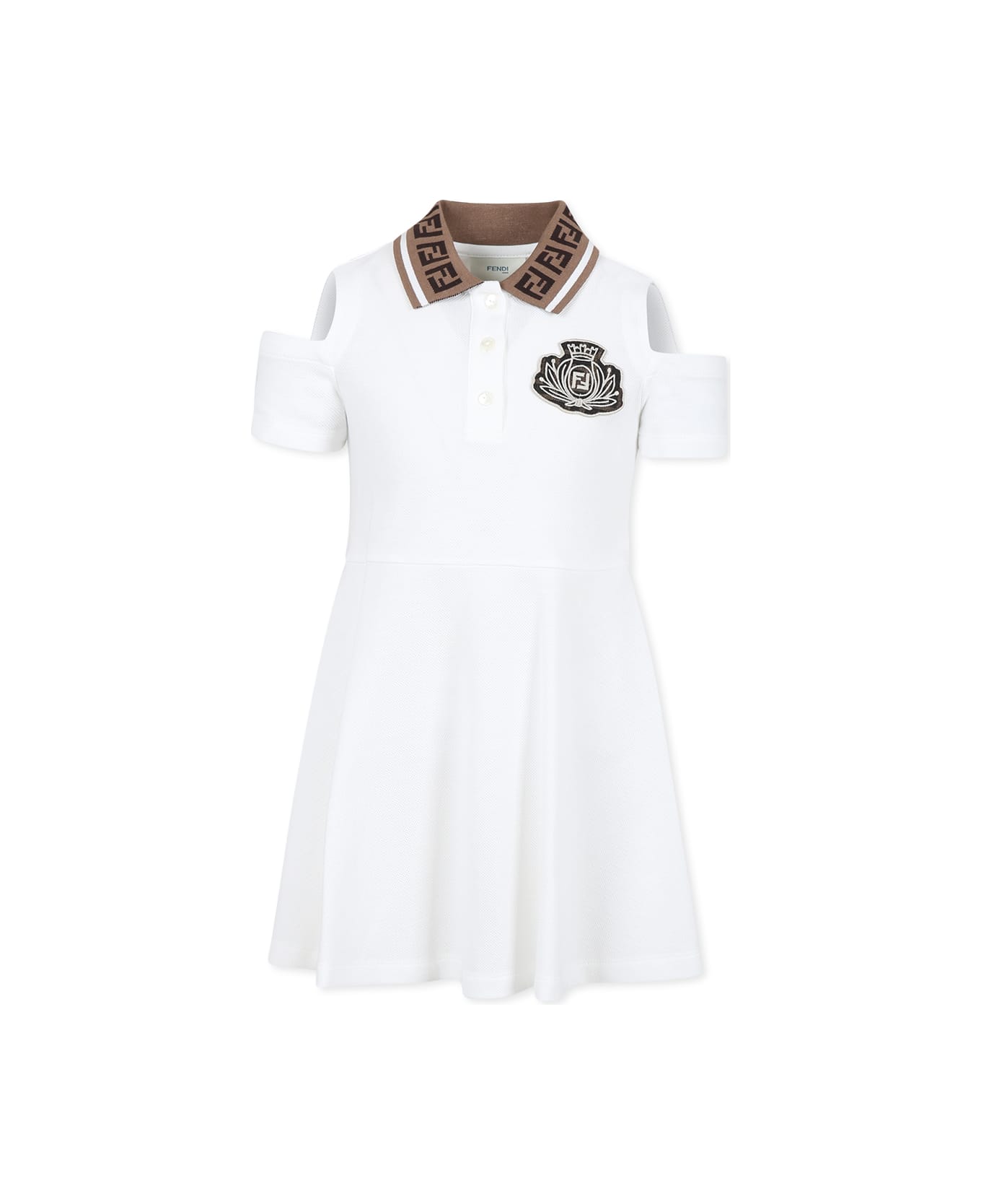 White dress from the luxury brand Fendi Kids made from cotton piqué. The short-sleeved model features pointed collar with the iconic tobacco-colored FF, a front button closure and cut-out details on the shoulders. It is embellished with a patch with an embroidered logo crest on the chest.