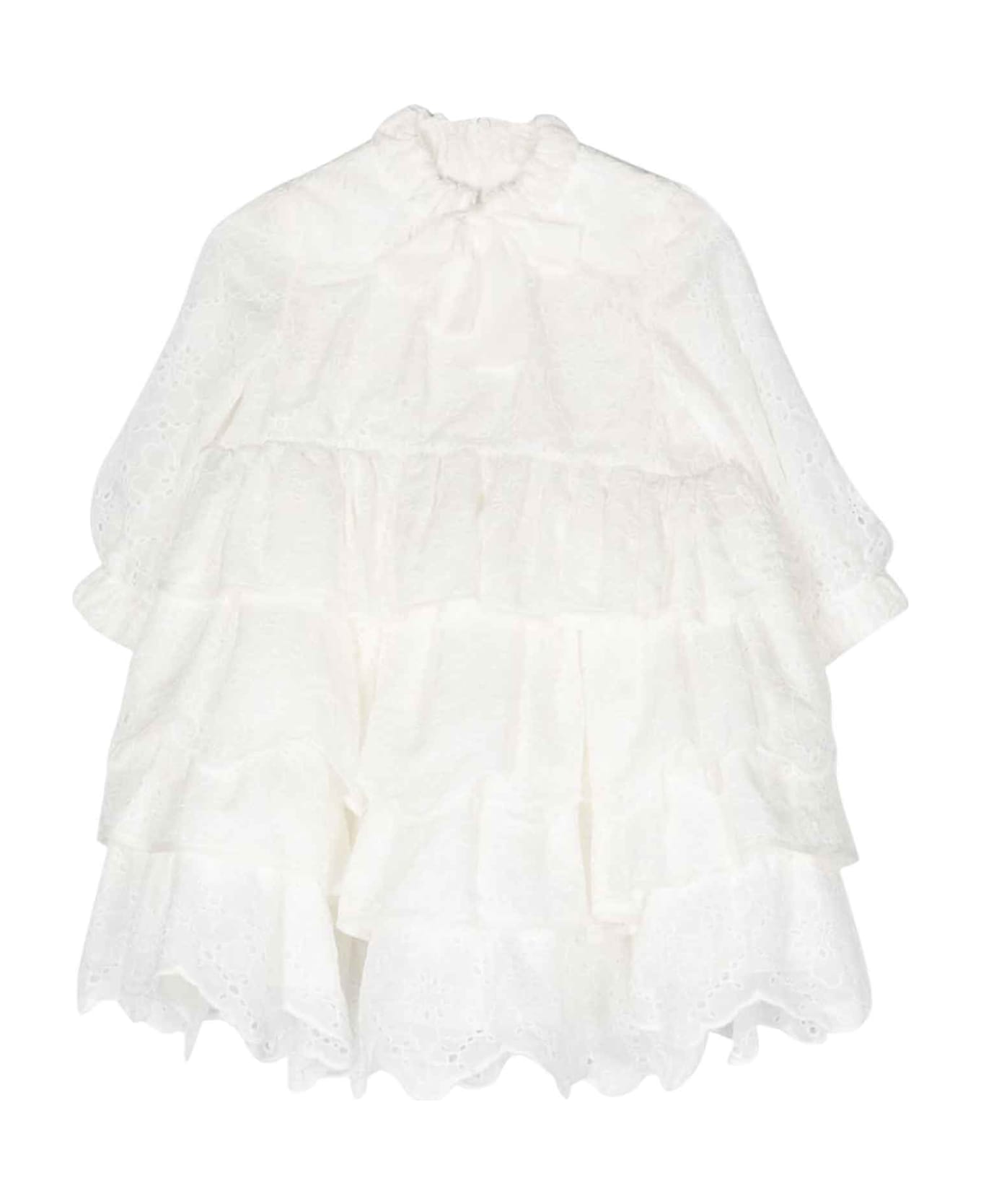 White dress girl Mi Mi Sol. English stitch decoration, scalloped hem, front bow closure and 3/4 sleeves. 100% Cotton