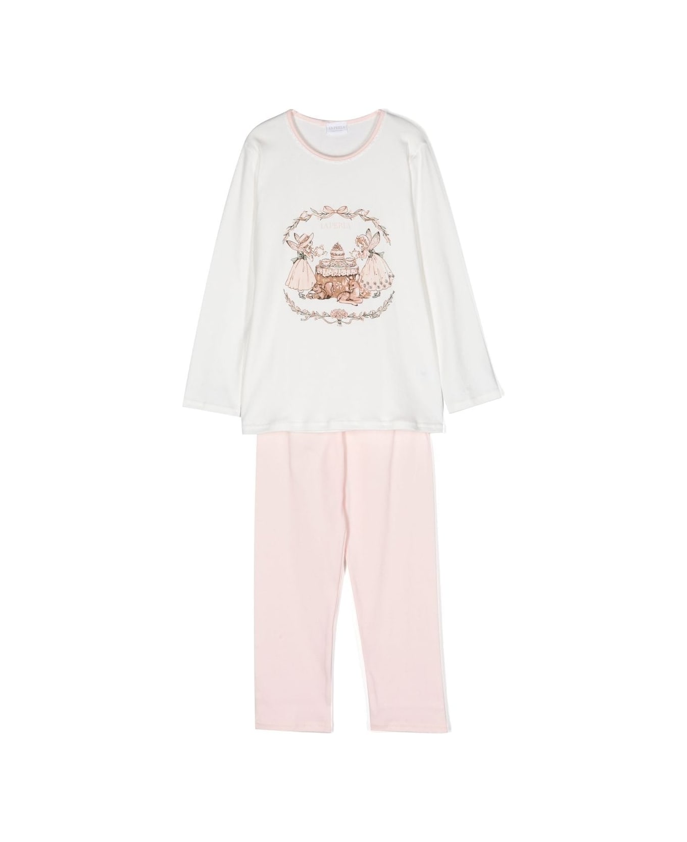 graphic-print long-sleeve pyjamas from LA PERLA KIDS featuring cotton, jersey knit, graphic print to the front, logo print to the front, round neck, long sleeves, straight hem, elasticated waistband, straight leg and white/pink.