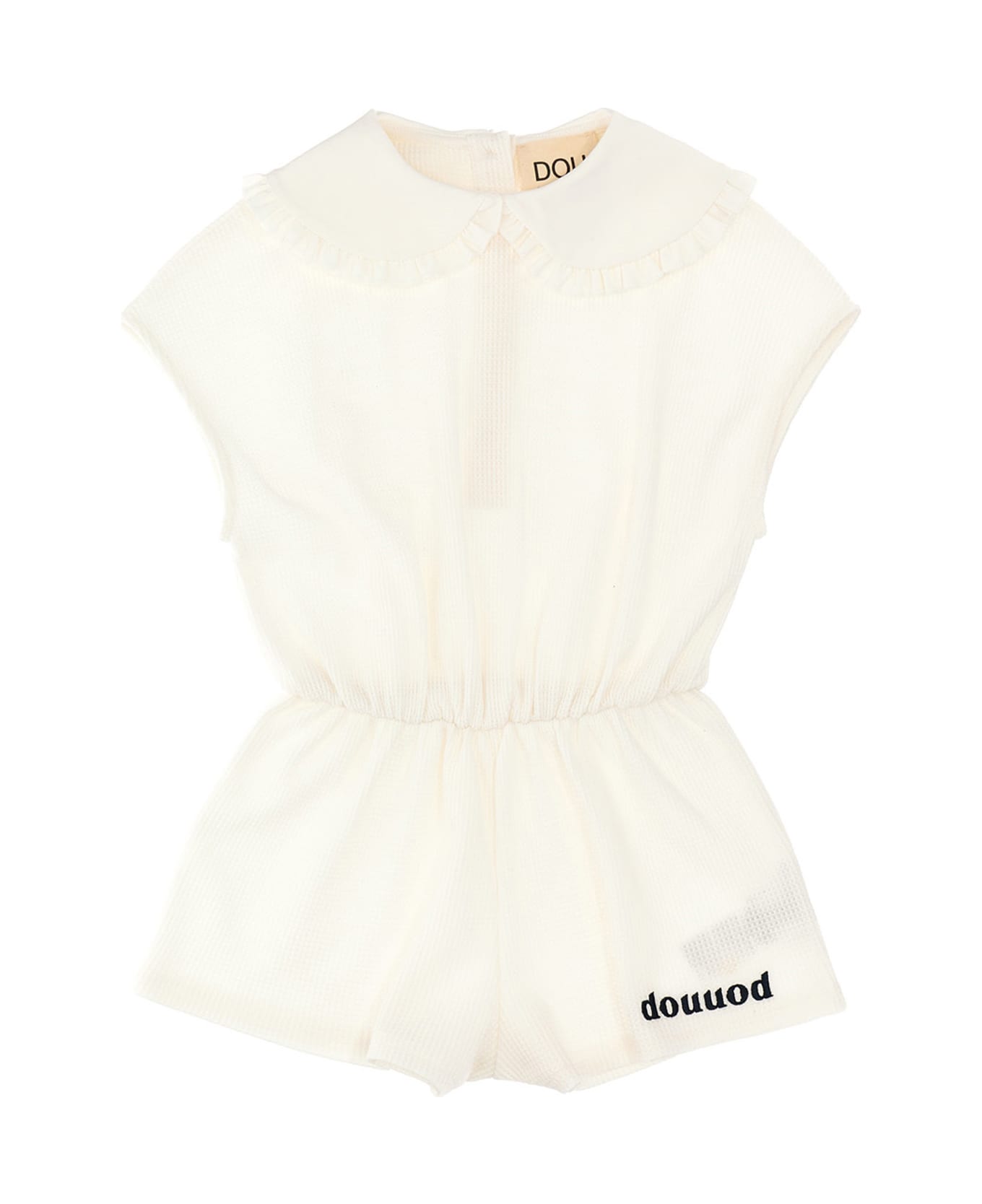 One-sleeved bodysuit featuring terry effect cotton, contrast logo embroidery, elastic waistband, short sleeves and a peterpan collar.