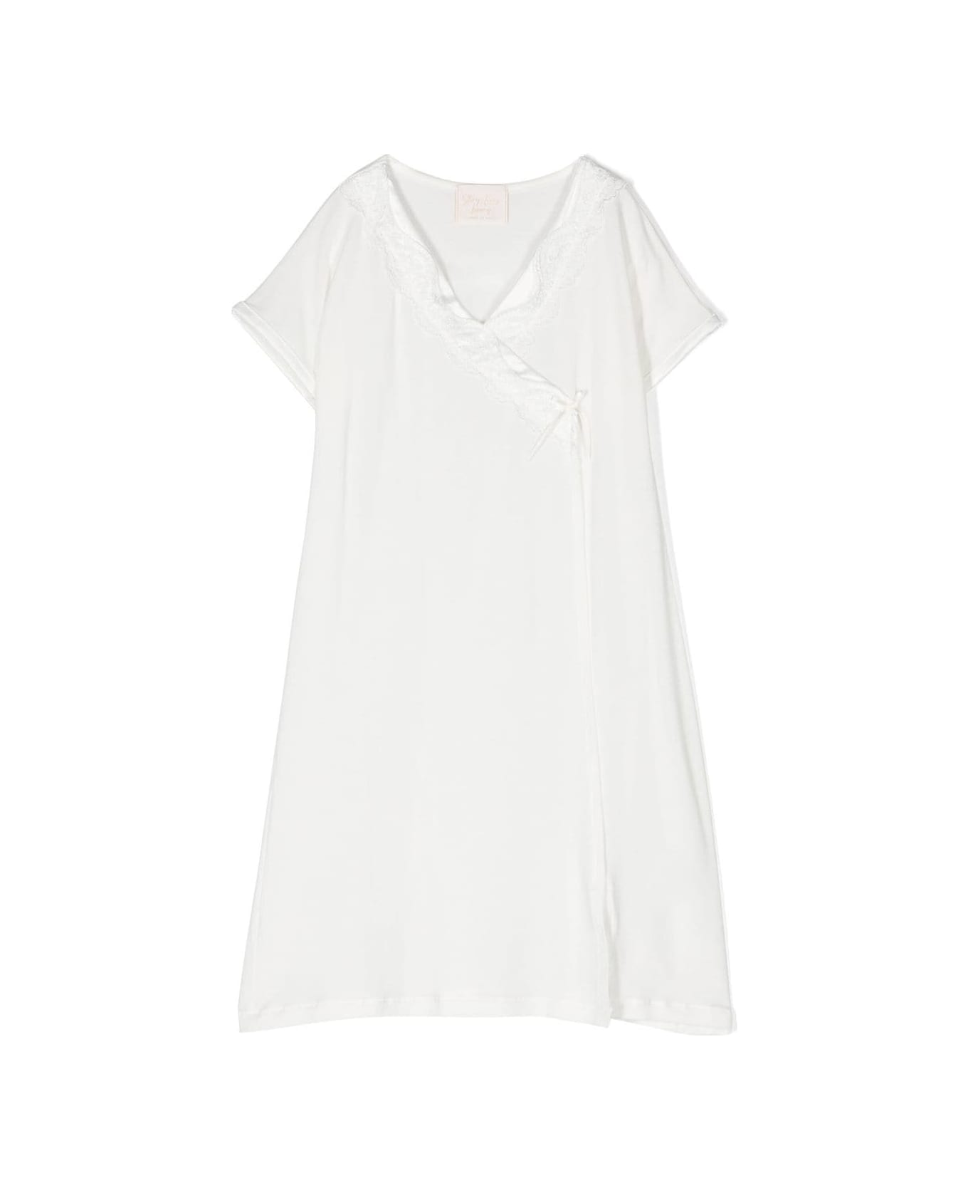 White, modal blend, jersey knit, lace trim, side knot fastening, wrap design, v-neck and short sleeves. Modal 95%, Spandex/Elastane 5% Composition: Modal, 95% , Spandex/elastam, 5%