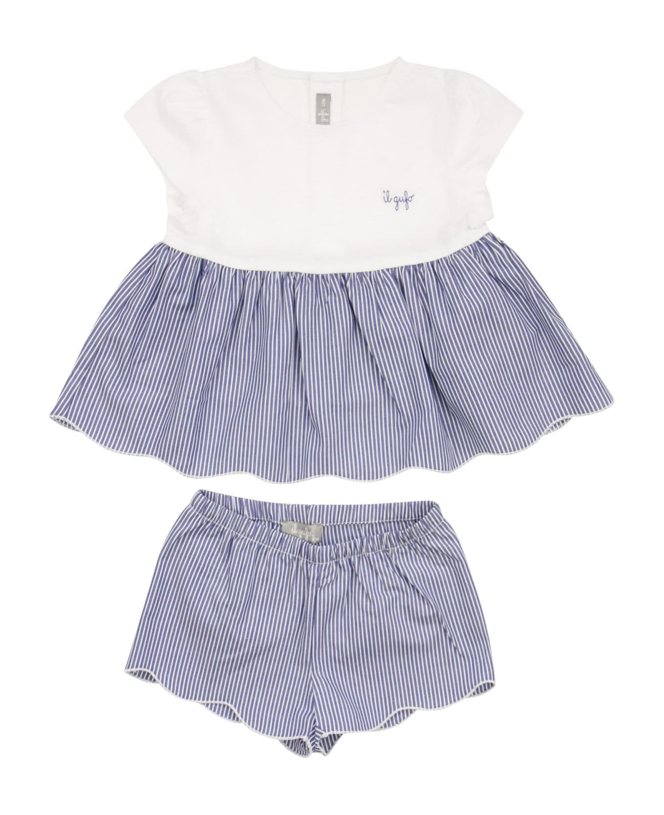 Two-piece outfit consisting of a white cotton jersey t-shirt with slightly puffed sleeves and a maxi ruffle appliqué in ink-blue striped cotton stick with a cape bottom that echoes the fabric of the trousers with an elasticated waist and cape bottom. - Edges embellished with overlock stitching. DESIGNER ID: P22DP386C1052. 4801