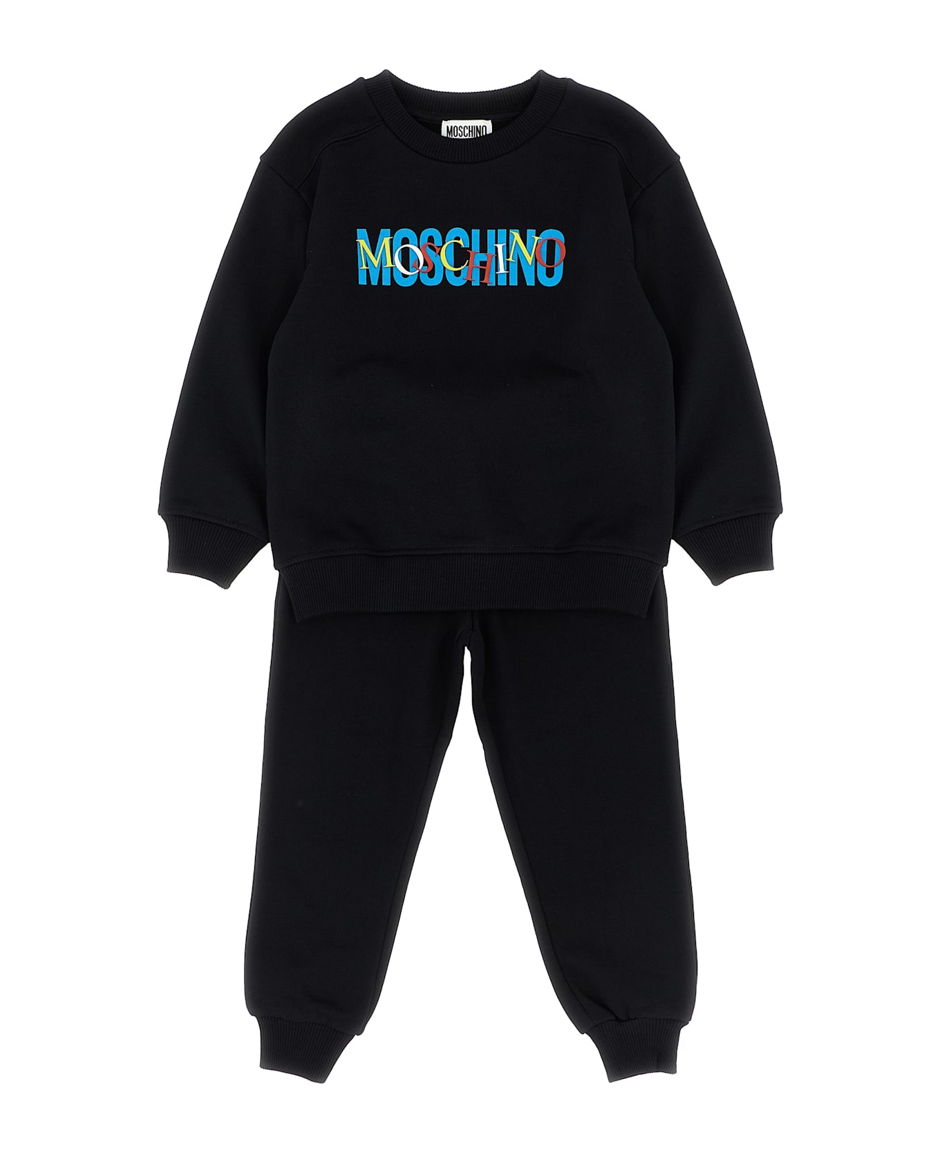 Fleece cotton suit with front logo print consisting of crewneck sweatshirt, long sleeves with cuffs and joggers with elastic and adjustable drawstring at the waist, pockets, ankle cuffs. Composition: 100% cotton