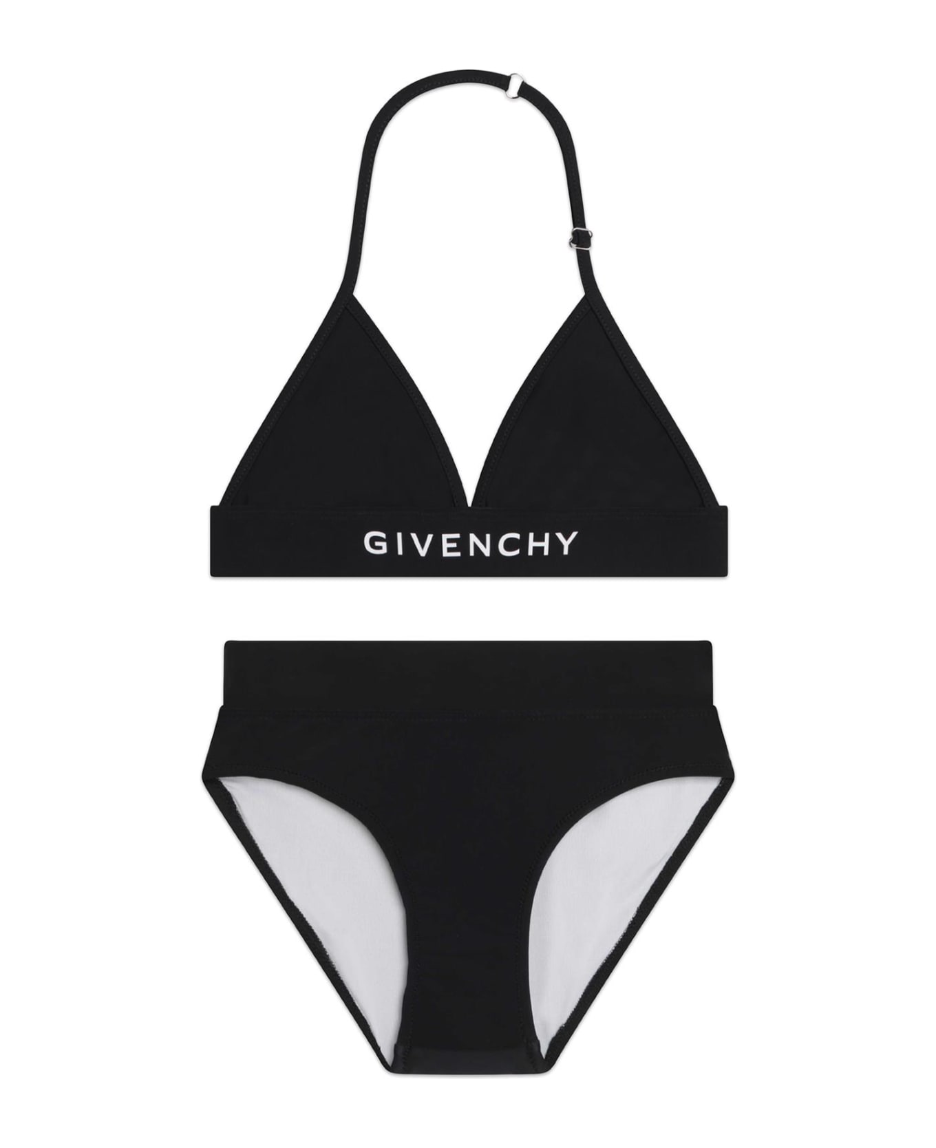 logo-print bikini set from Givenchy Kids featuring black/white, stretch-design, logo print to the front, triangle cup, halterneck tie fastening, mid-rise and elasticated waistband. Be mindful to try on swimwear over your own garments..