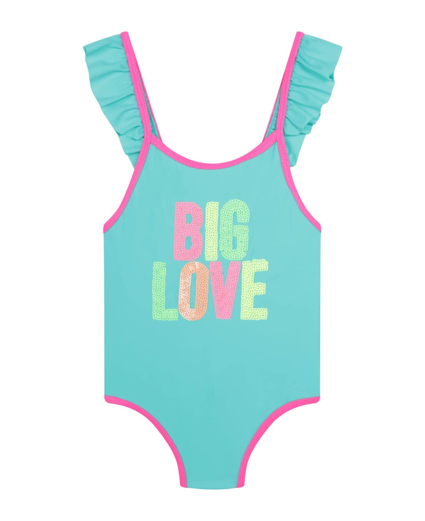Big Love print swimsuit from Billieblush featuring aqua blue, stretch-design, slogan print to the front, spaghetti straps and ruffled detailing. Be mindful to try on swimwear over your own garments..