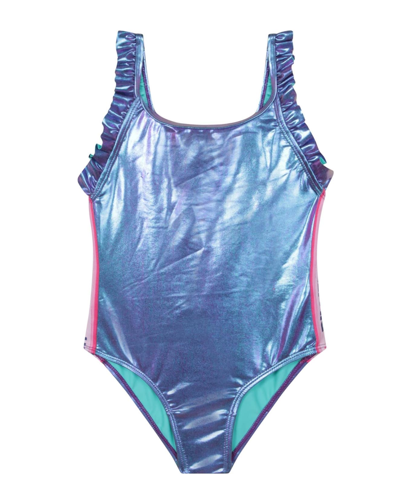 metallic-effect logo-print swimsuit from Billieblush featuring light blue, metallic effect, logo-tape detailing, ruched detailing, U-neck and sleeveless. Be mindful to try on swimwear over your own garments..