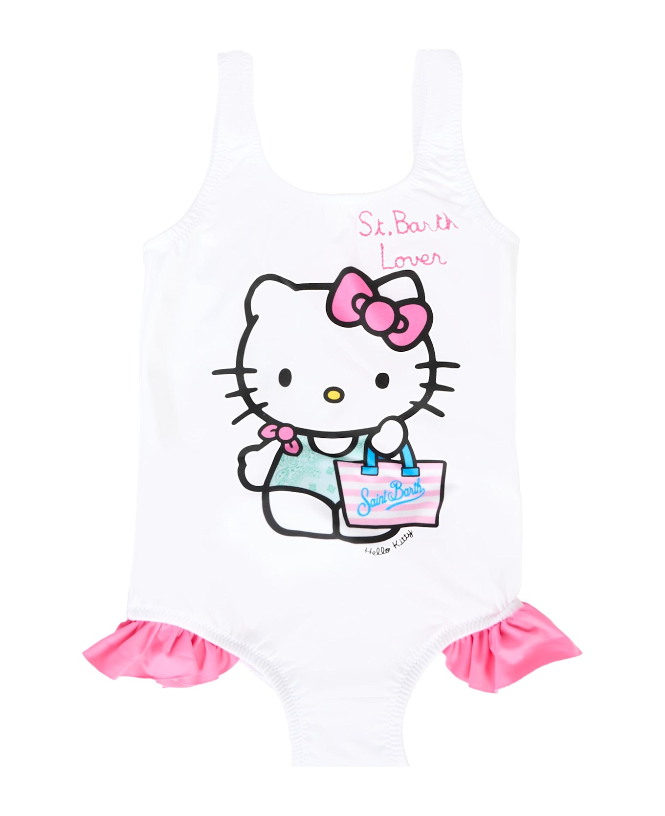 White one-piece swimsuit with elastic straps, neckline on the back and fuchsia ruffles on the sides. It is embellished with Hello Kitty print and embroidered logo on the front and with logo patch on the back.