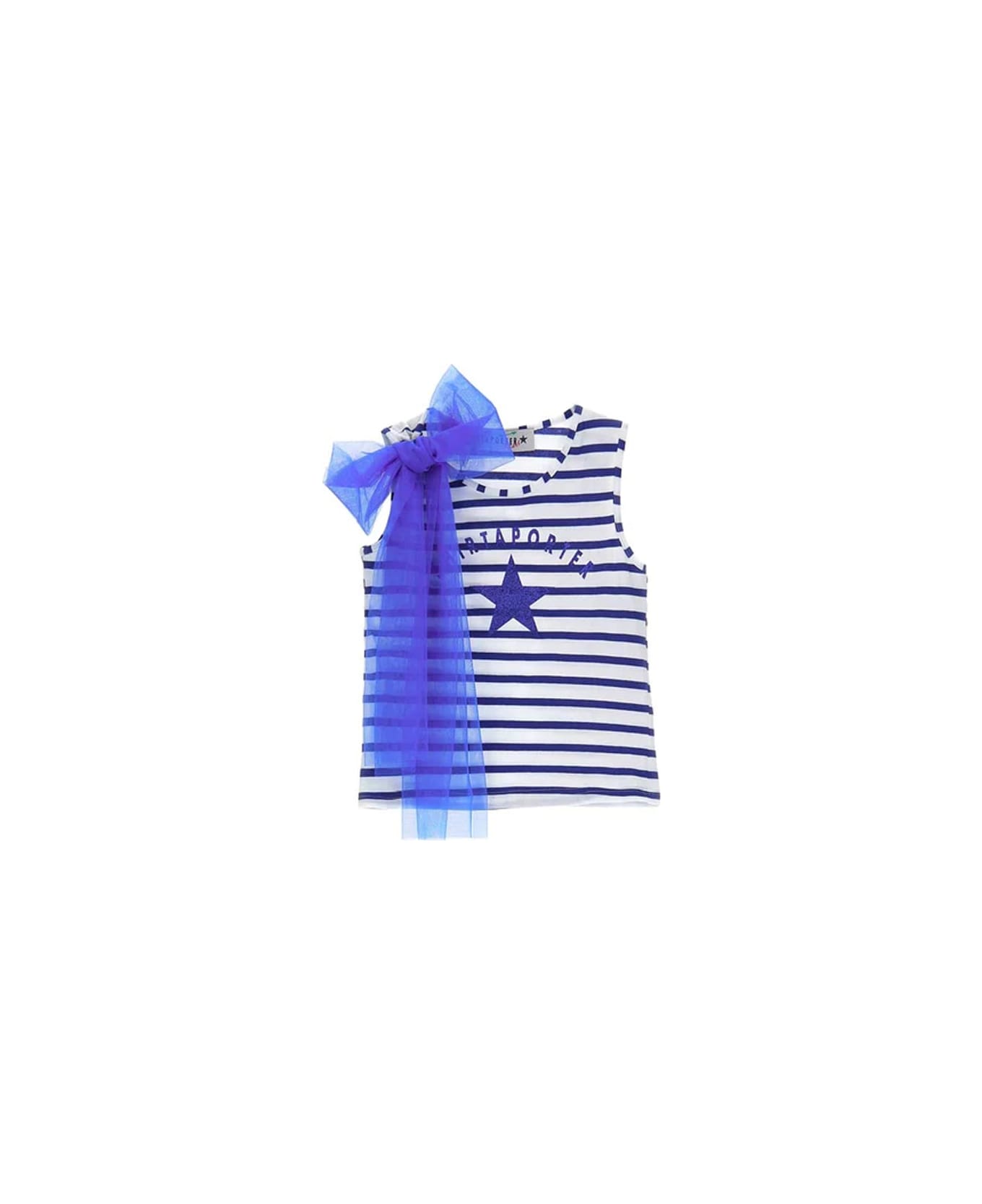 Canotta bianca a righe blu, con fiocco in tulle. 100% cotone