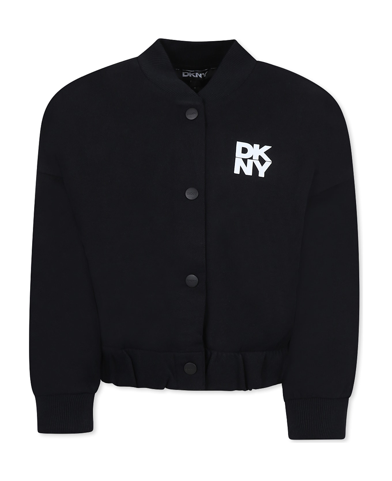 Black bomber jacket in brushed cotton, with long sleeves, low ribbed collar, front fastening with snap buttons, ribbed cuffs and elasticated hem. It is embellished with a gold logo on the chest.
