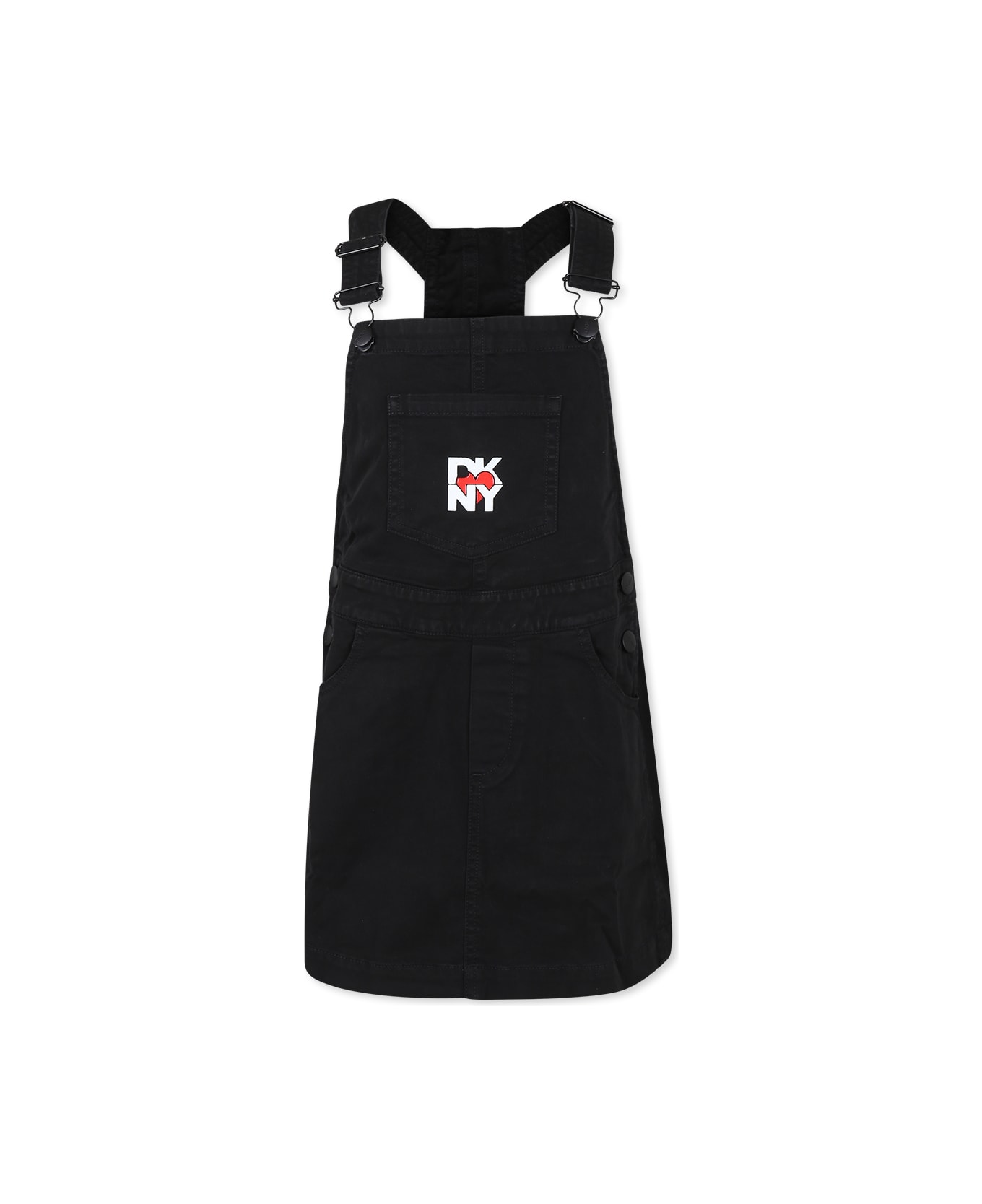 Black strappy dress, with pockets at the front and on the back, shoulder straps with metal clips fastener and buttons faster at sides; it is embellished with white rubbered logo heart on the front. This items belongs to Hear capsulue, ispired from the adult collection.