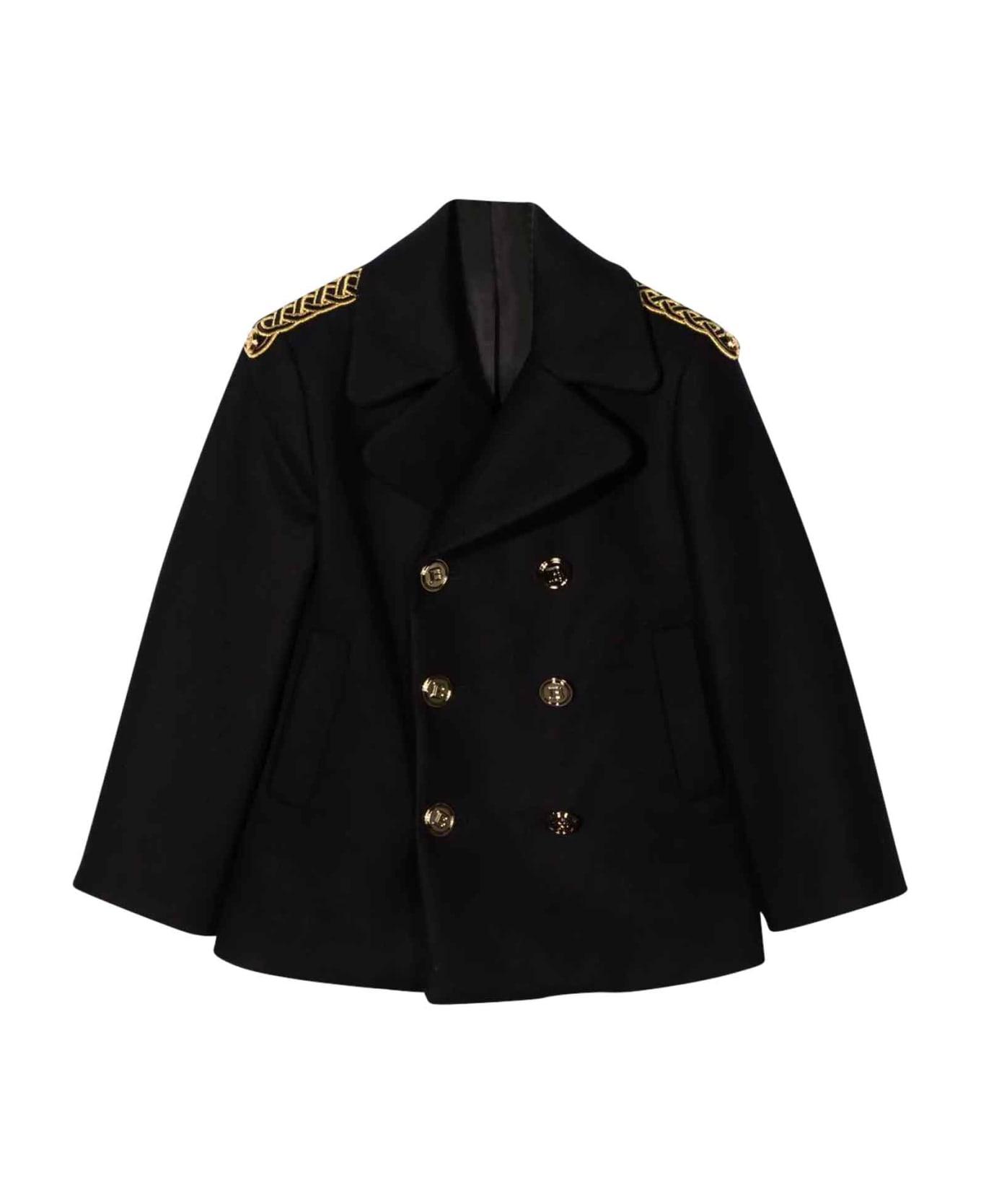 Blue jacket unisex. Embroidered design, double-breasted closure with buttons, bellows pockets on the sides and long sleeves. Virgin Wool 70%, Polyamide 25%, Cashmere 5%