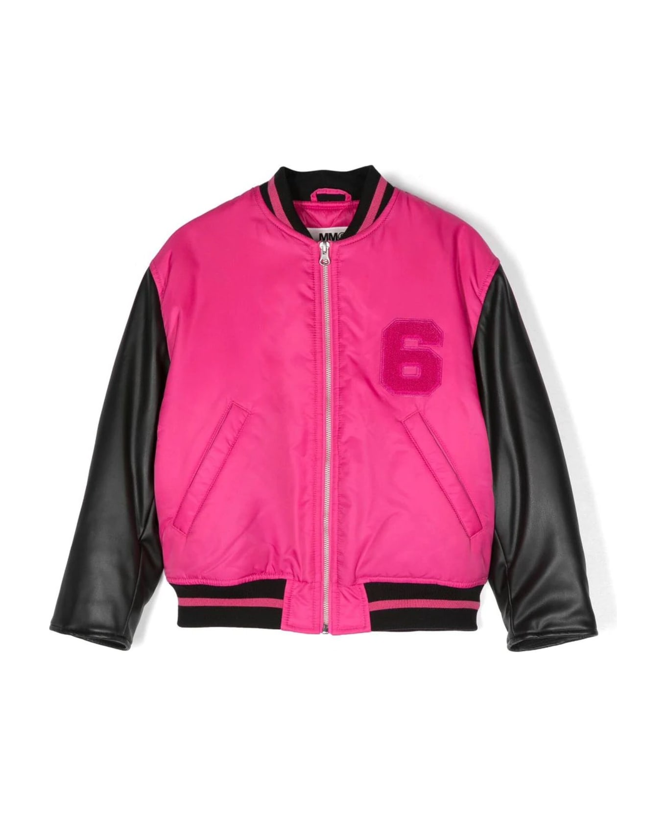 Fuchsia and black bomber jacket, padded design, ribbed trim, silver-tone hardware, logo-embossed buttons, embroidered logo at the chest, band collar, front zip fastening, drop shoulder, long sleeves, two front flap pockets