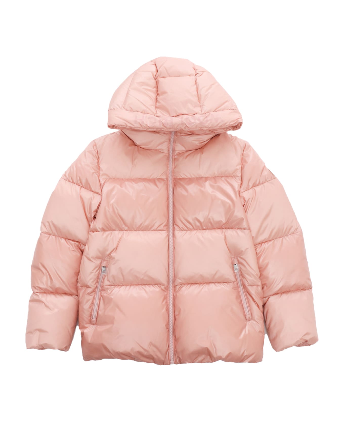 Pink down jacket with glossy finish, fixed hood with tone-on-tone lettering, zip fastening, side pockets, down padding, logo detail