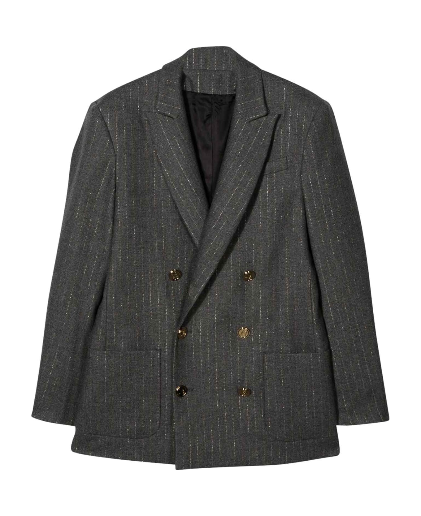 Gray jacket unisex. Pinstripe pattern, double-breasted button closure, two front flap pockets and long sleeves. Wool 55%, Polyester 41%, Spandex / Elastane 2%, Synthetic Fiber 2%