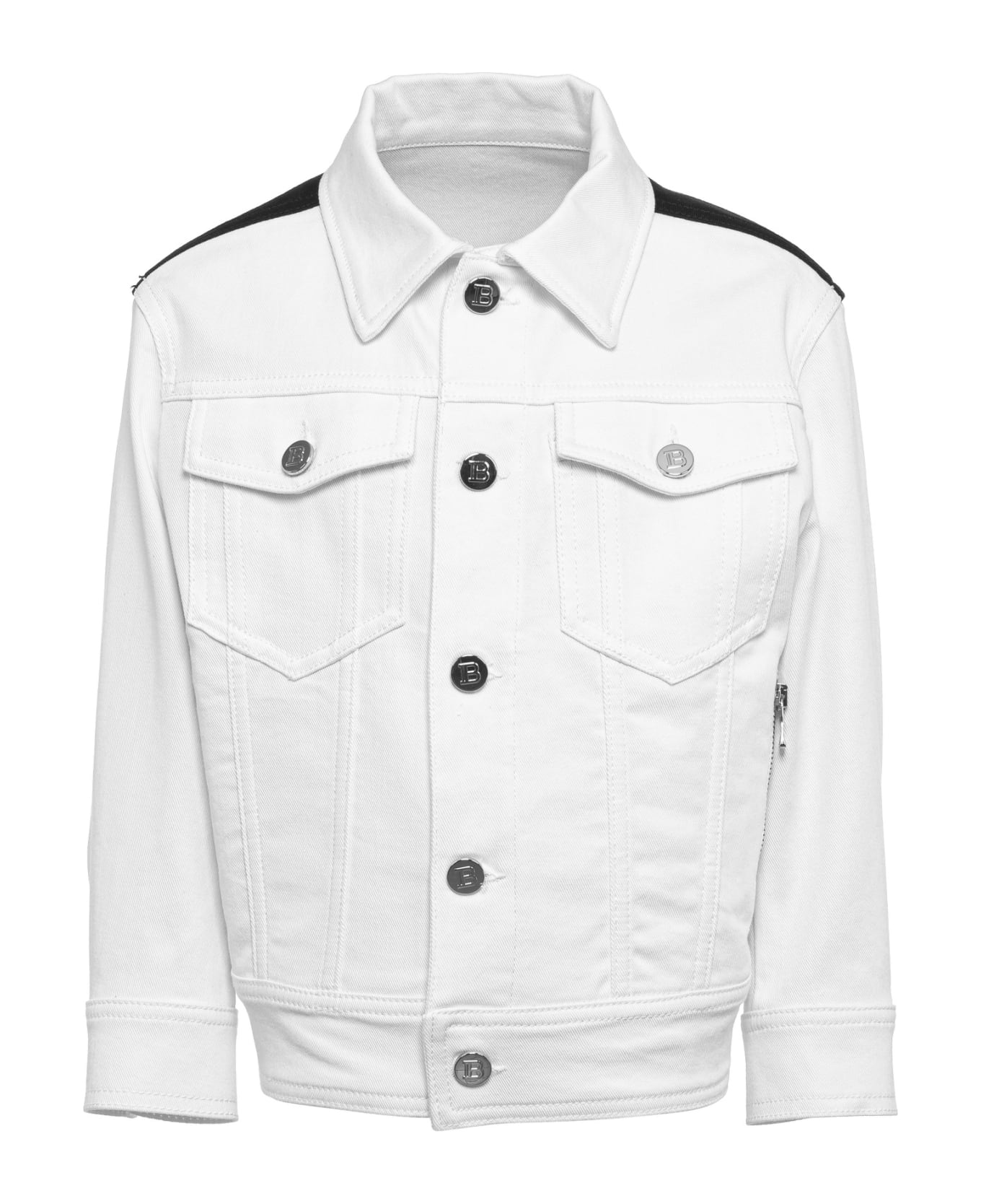 logo-print jacket from Balmain Kids featuring white/black, stretch-cotton, logo print to the rear, classic collar, front button fastening, long sleeves, front flap pockets and front zip fastening pockets. Composition: Cotton, 92% , Modal, 6% , Elastane, 2%