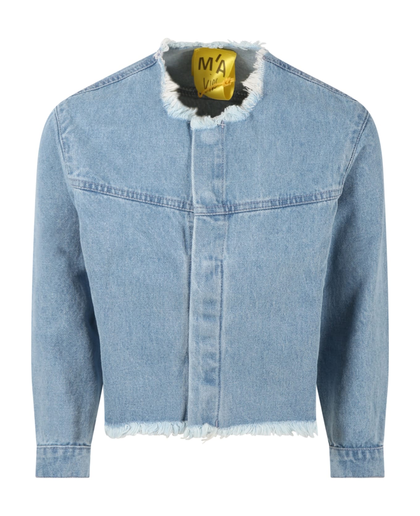 Light blue denim jacket, with crew neck, long sleeves, side pockets and press-studs closure on the front. It s embellished with fringed hemlines and loged patch on the back.