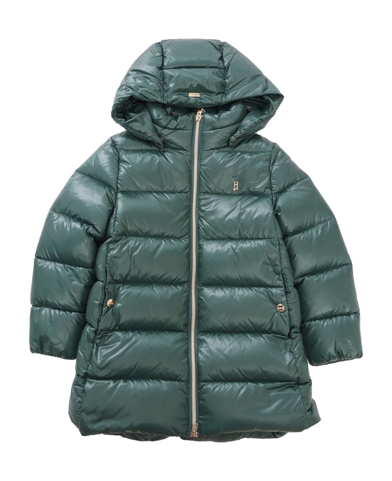 Quilted down jacket, goose down padding, removable hood, metal logo details, two-way zip closure, side pockets with snap buttons, flared Composition: 100% POLYAMIDE LINING 100% POLYAMIDE FILLING 100% POLYESTER PADDING 80% DOWN 20% FEATHER