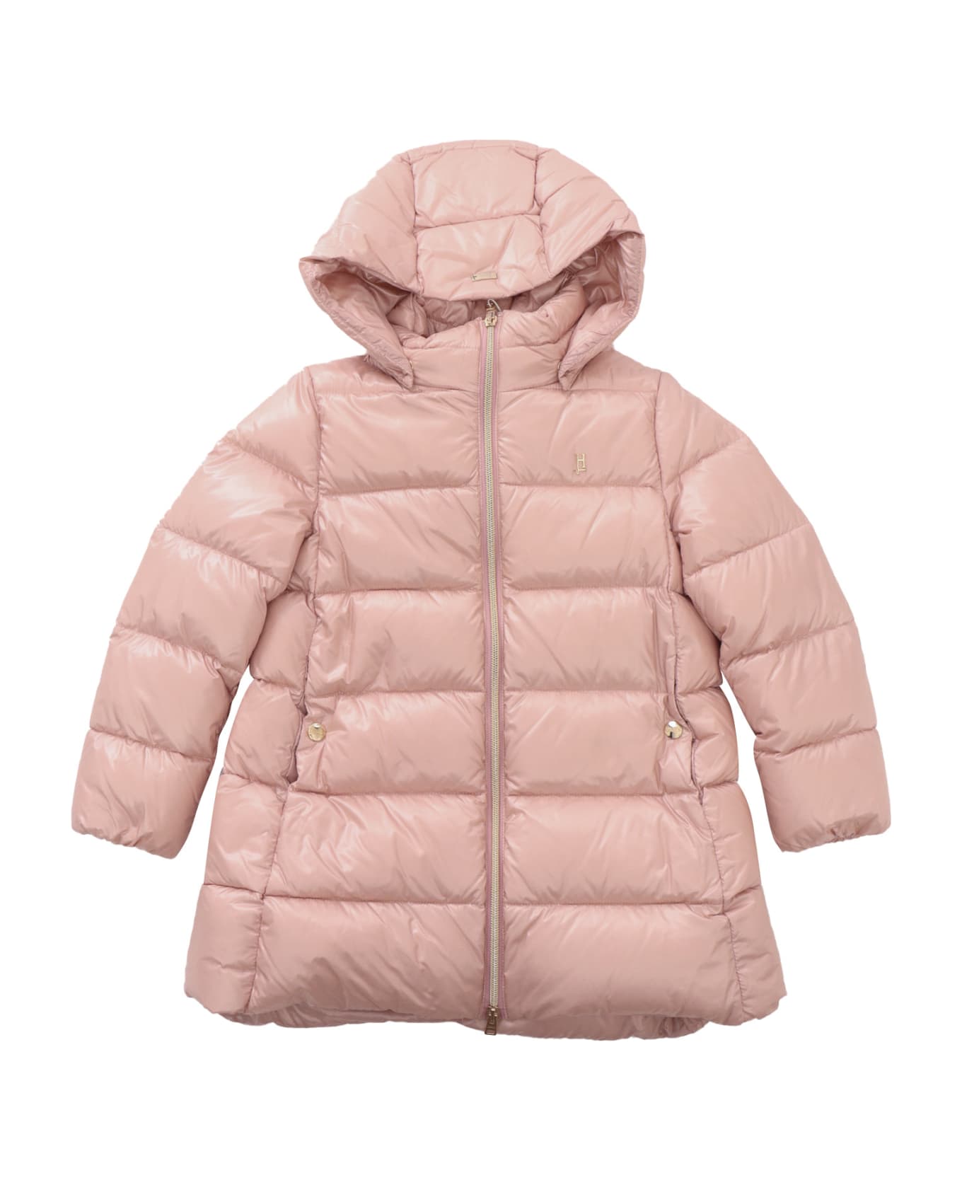 Quilted down jacket, goose down padding, removable hood, metal logo details, two-way zip closure, side pockets with snap buttons, flared Composition: 100% POLYAMIDE LINING 100% POLYAMIDE FILLING 100% POLYESTER PADDING 90% DOWN 10% FEATHER