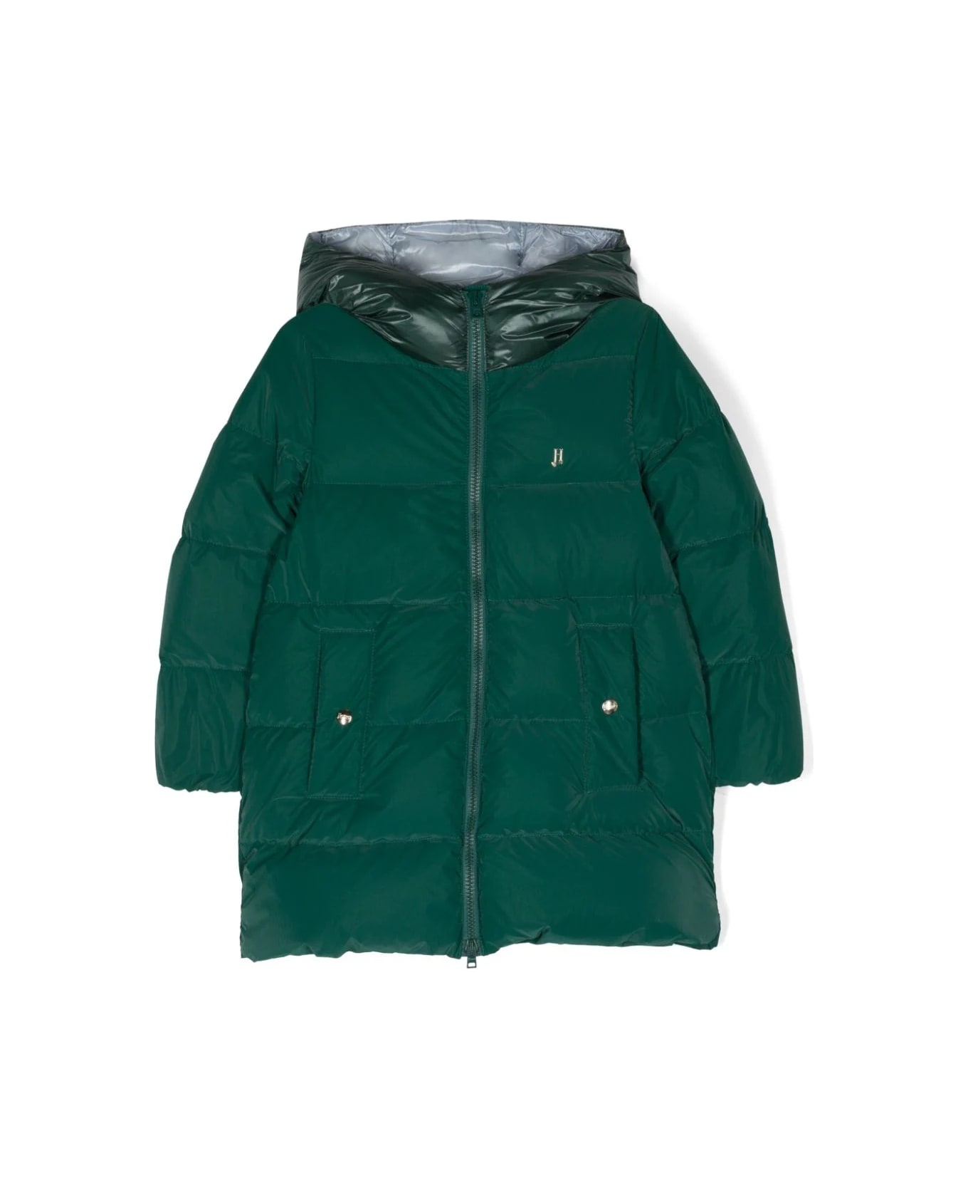 Piumino con logo con cappuccio imbottito con piume d'anatra, placca con logo, chiusura frontale con zip e due tasche con inserti