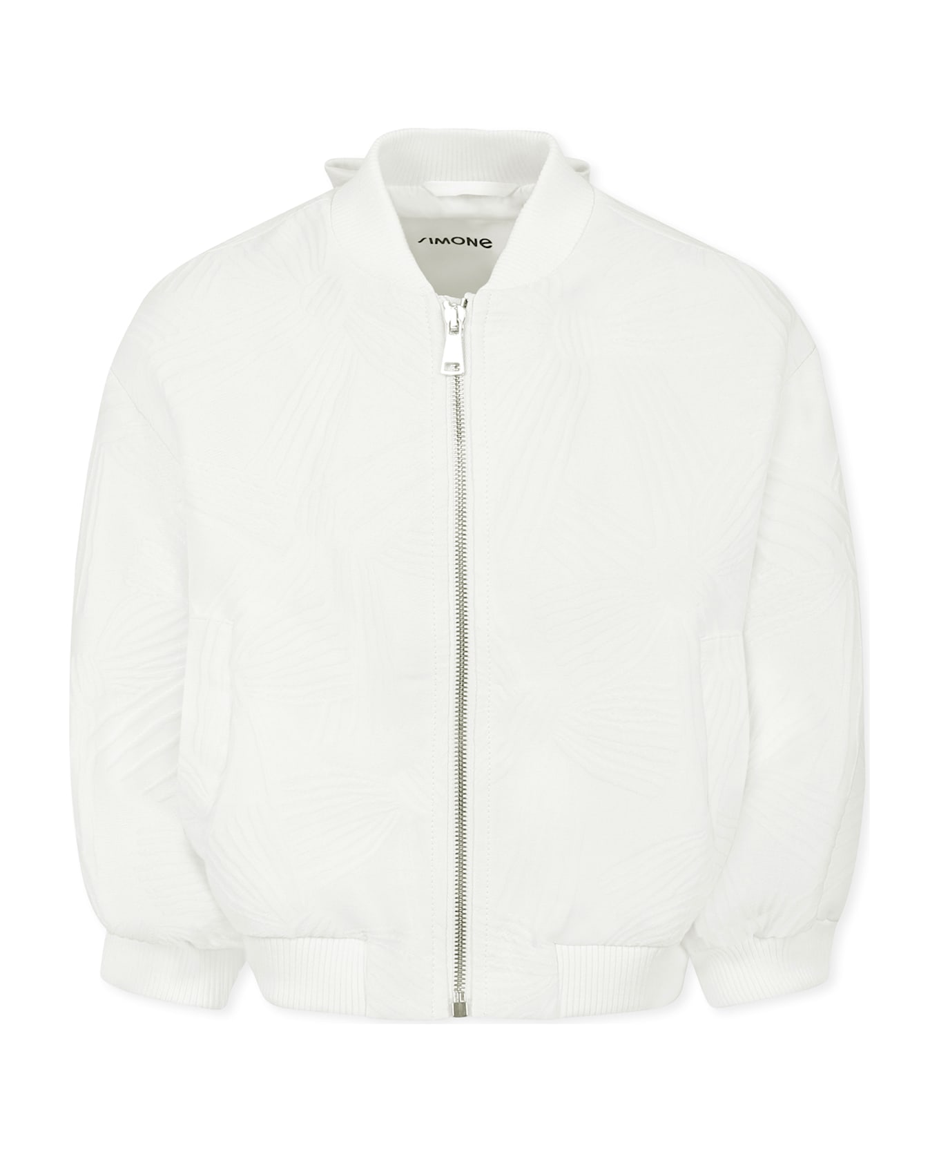 Lightweight white bomber jacket with long sleeves, low ribbed collar, front zip fastening, side pockets, removable bow on the back, ribbed cuffs and hem. It is embellished with all-over jacquard bow.