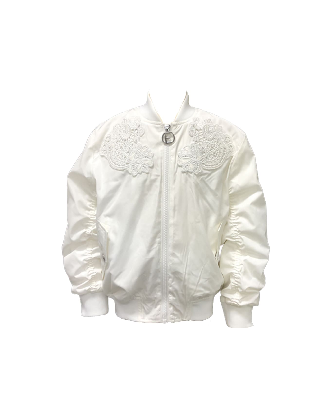 Ermanno Scervino Junior bomber jacket made of white nylon and embellished with tone-on-tone embroidery sewn on the upper front. Regular fit model featuring long sleeves, ribbed trim, zip fastening, buttoned pockets and tone-on-tone embroidered logo on the left sleeve.