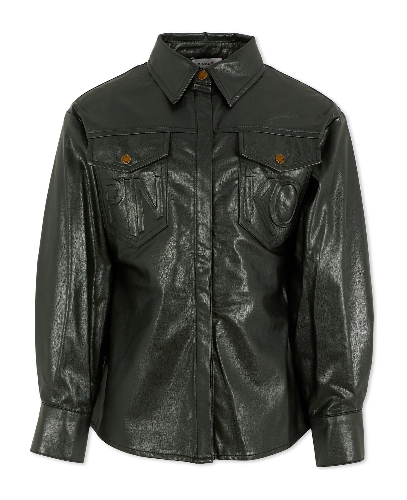 Black faux leather shirt with long sleeves, a pointed collar, a snap button front, and buttoned flap chest pockets. It is embellished with an embossed logo.