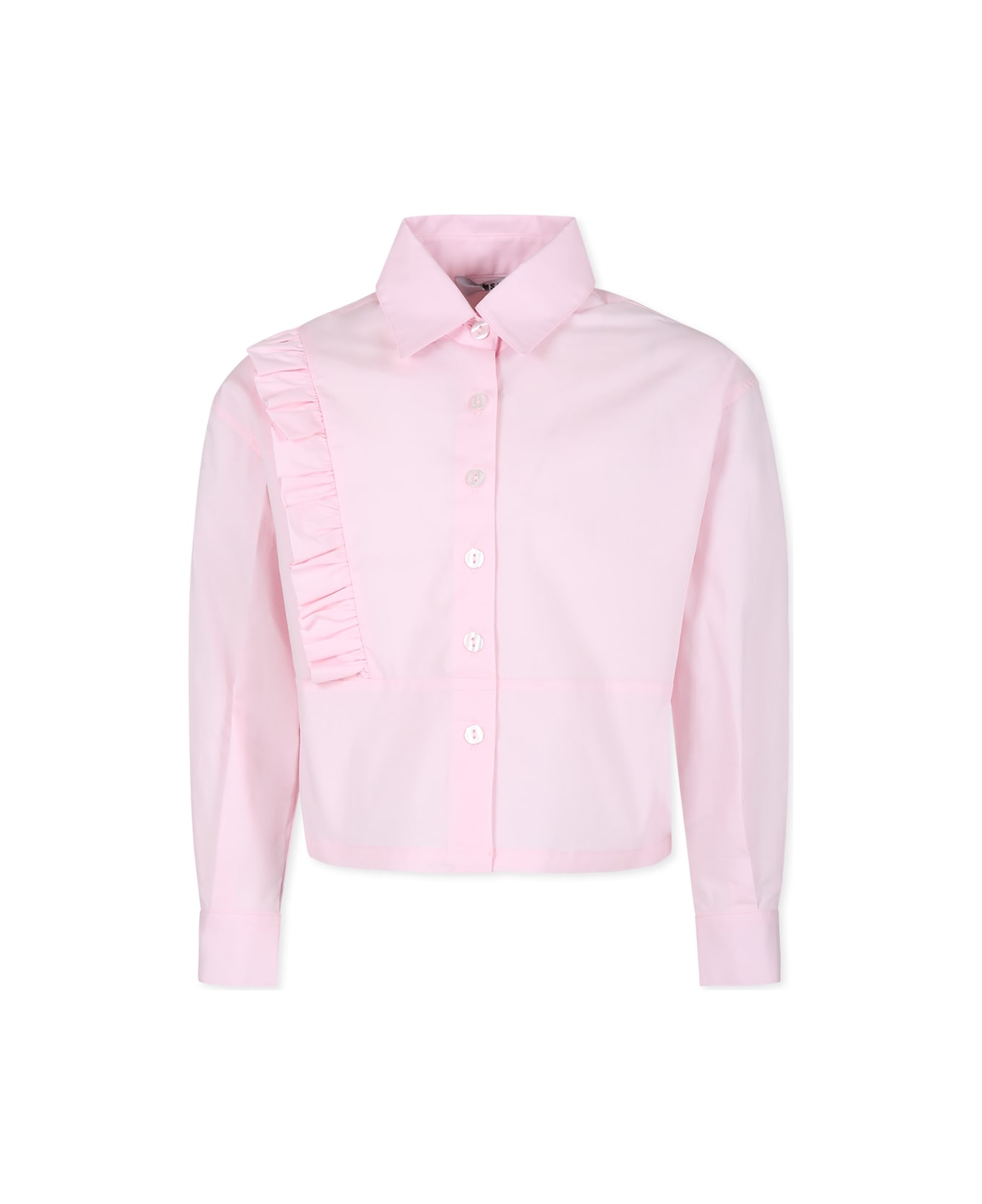 Pink long-sleeved shirt, with pointed collar, front button closure and ruffles on one side. It is embellished with MSGM logo embroidered on the back.