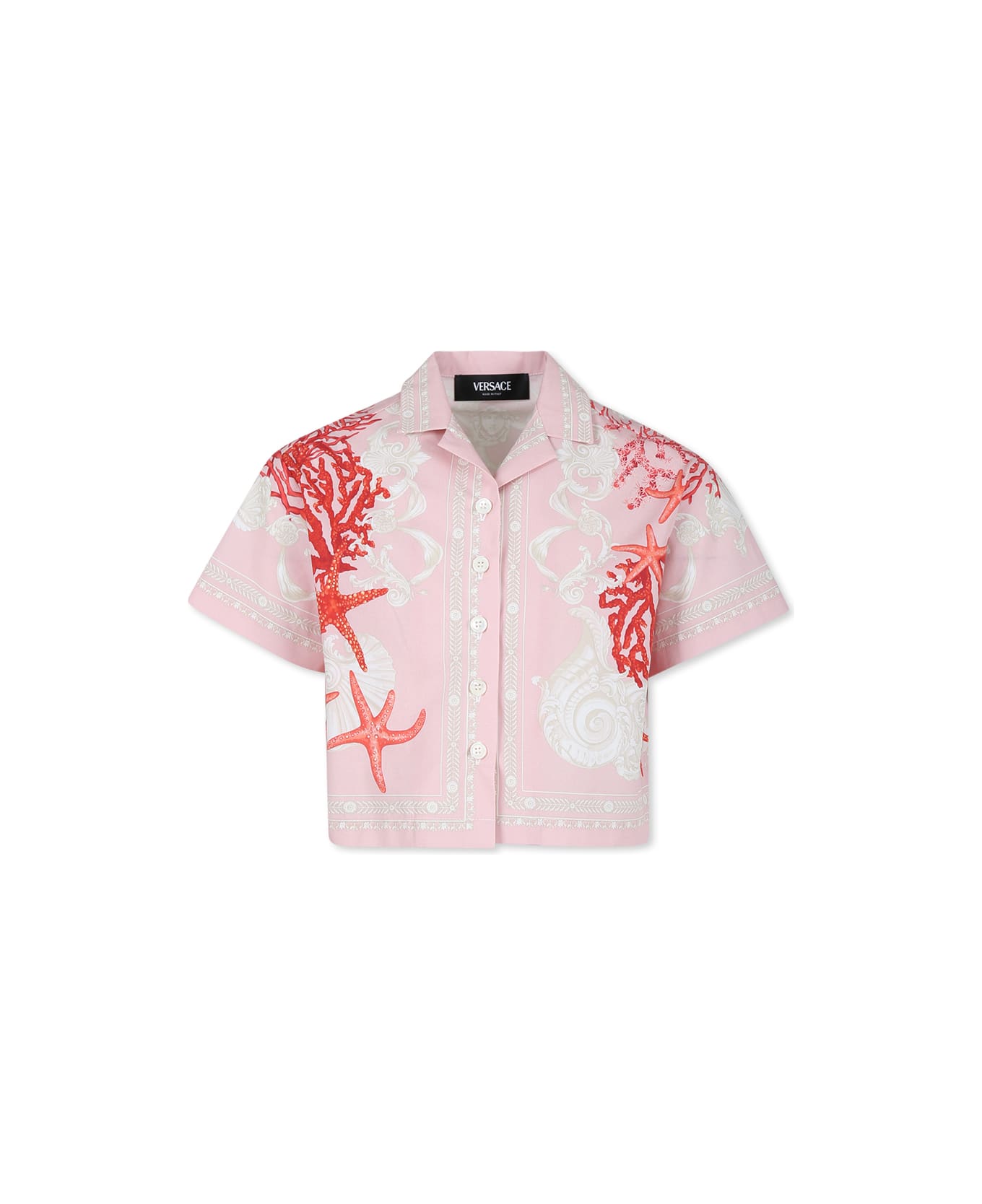 Pink shirt from the luxury brand Versace, made of soft, light cotton poplin. The short-sleeved shirt features a front button closure and a lapel collar. It is embellished with the iconic Barocco Sea motif characterized by starfish, shells and corals. This item is part of the La Vacanza capsule.