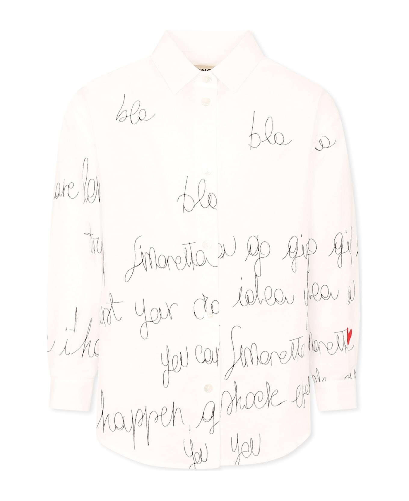 White cotton shirt, long sleeves, with pointed collar and front button closure. It is embellished with writing, logo and hearts, embroidered on the sleeves and on the front.