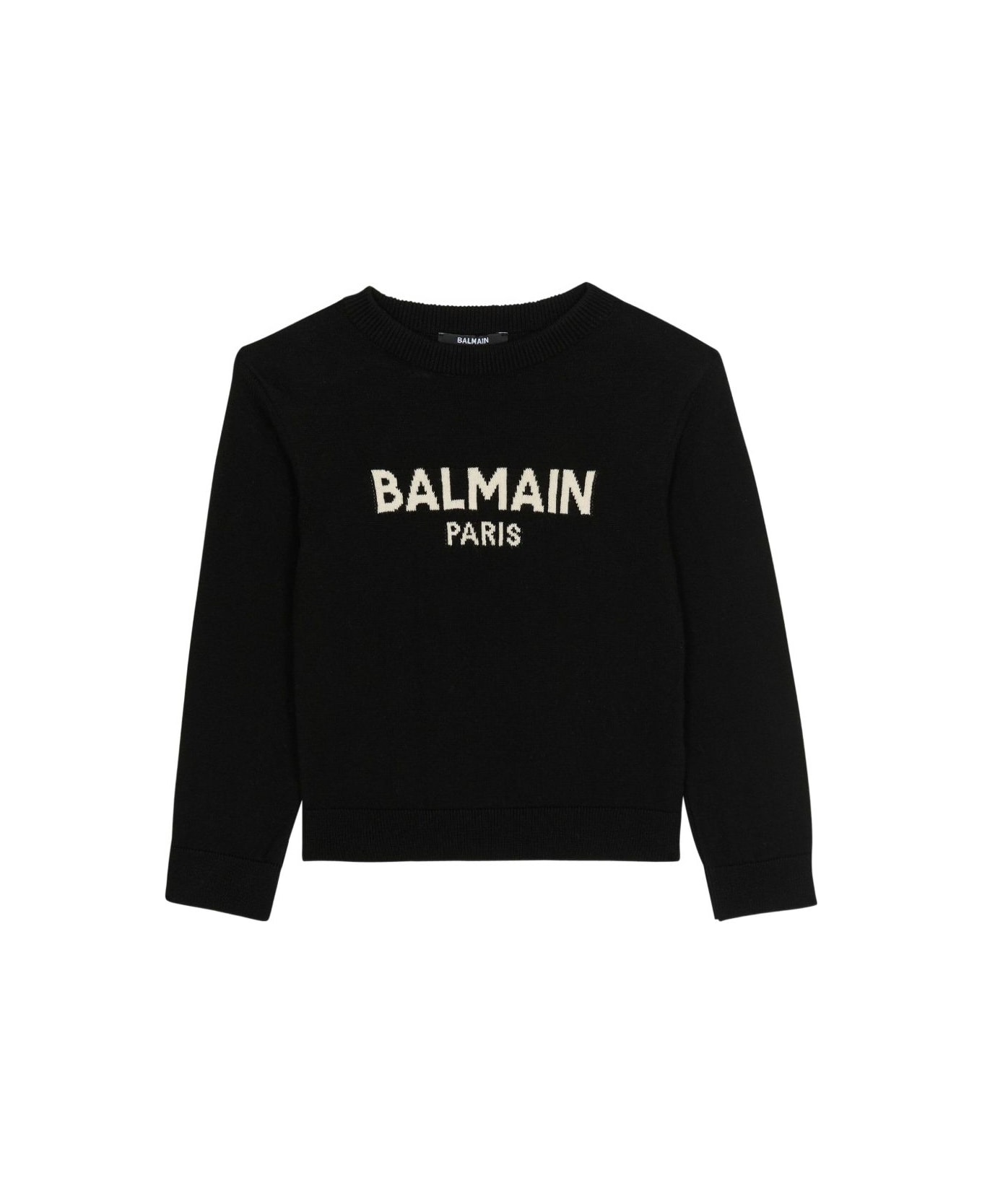 Our team has selected this piece for its high stylistic content and its eco-sustainability. Balmain Kids Sweater with inlaid logo Black crewneck, long sleeves, ribbed cuffs and bottom Composition: 85% Cotton, 15% Wool