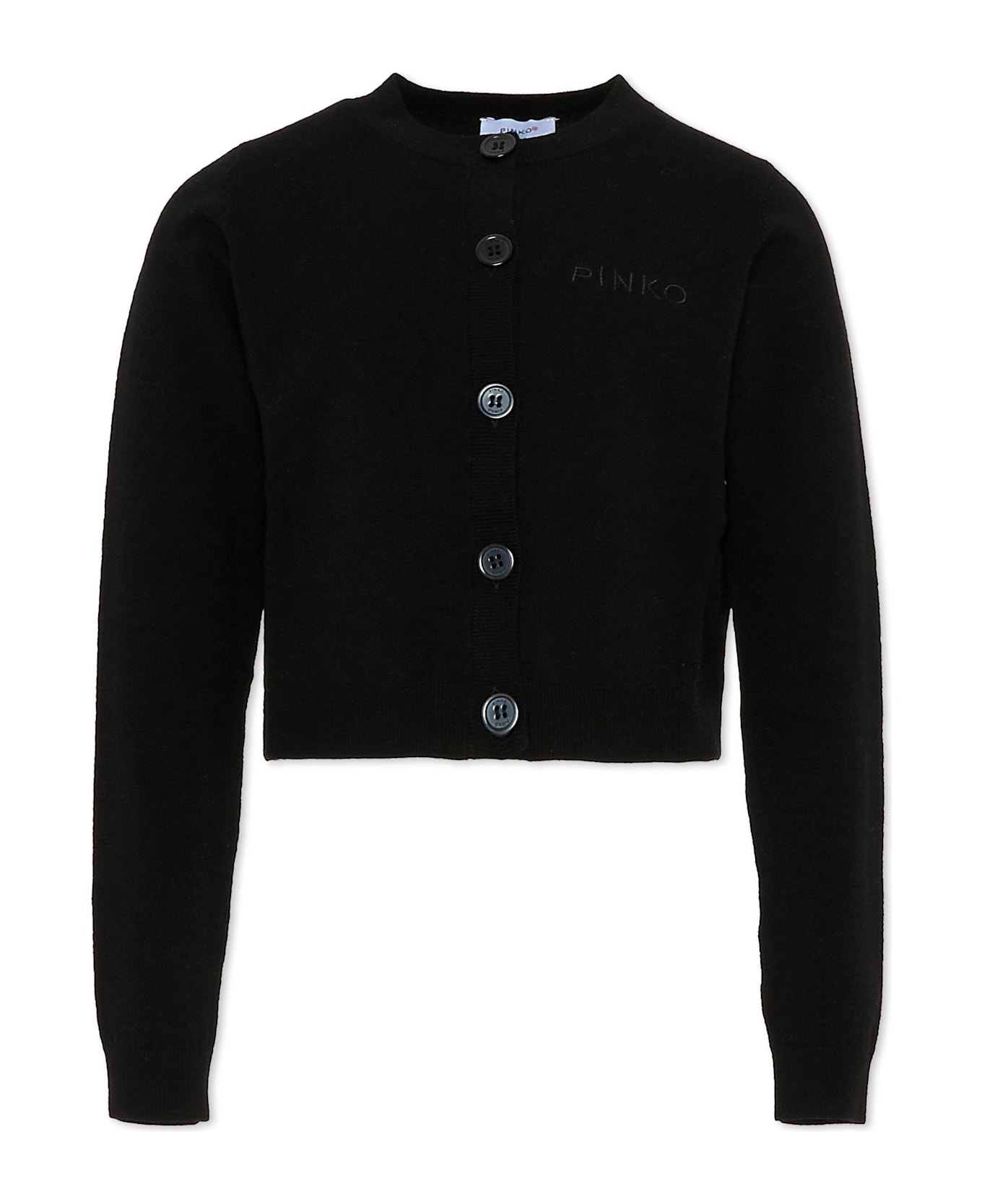 Black long-sleeved cardigan with a ribbed crew neck, button front, and ribbed cuffs and hem. It is embellished with an embroidered logo on the chest.