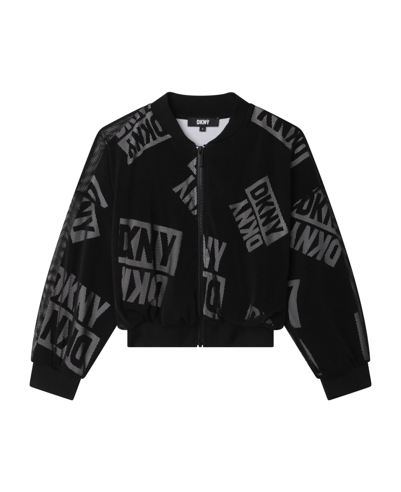 logo-print mesh zip-up jacket from DKNY KIDS featuring black/white, stretch-design, micro-mesh panels, all-over logo print, front zip fastening, long sleeves and straight hem.