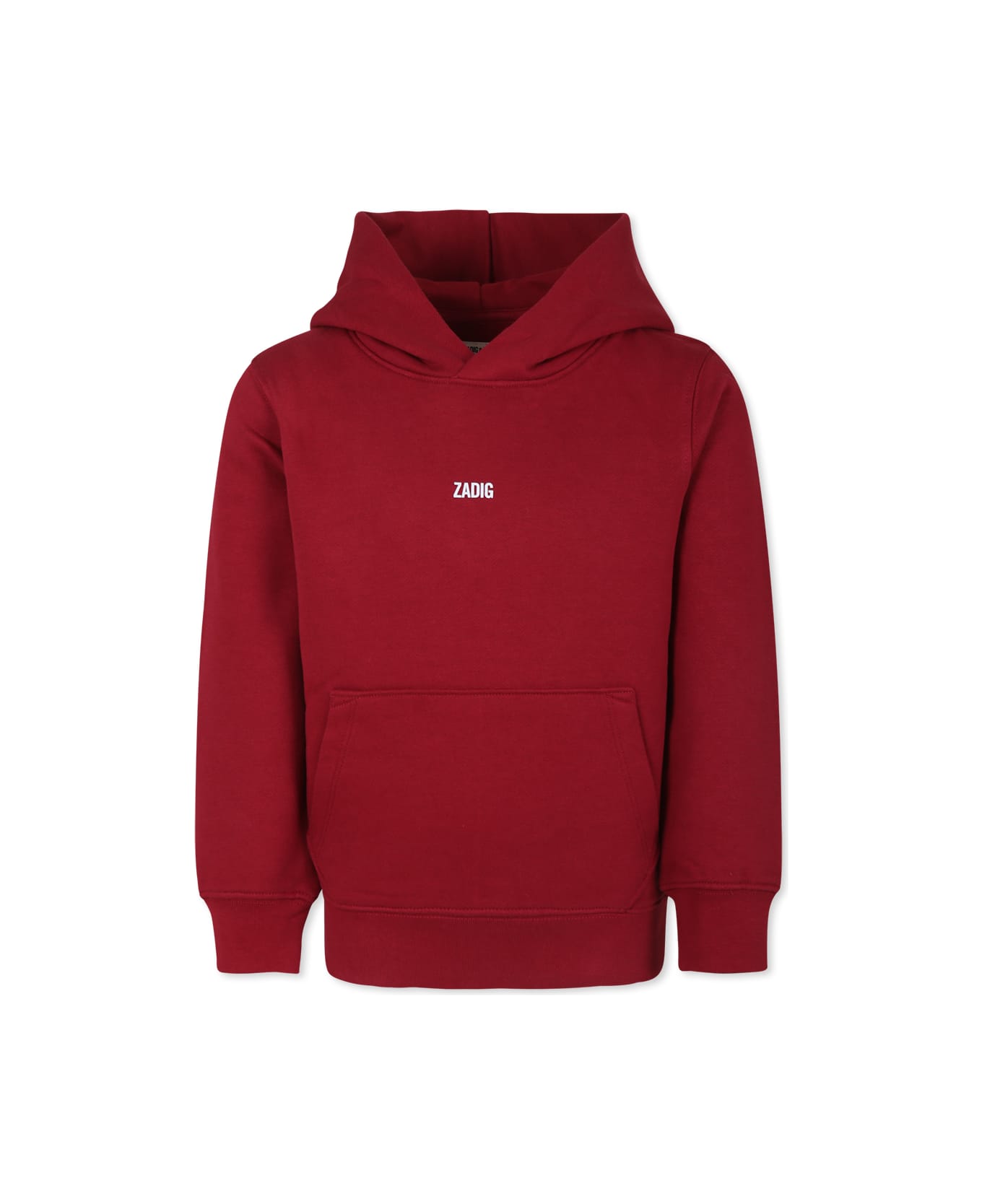 Burgundy sweatshirt in fleece cotton, long sleeves, with hood, front pocket, ribbed cuffs and hem. It is embellished with front logo and print on the back.