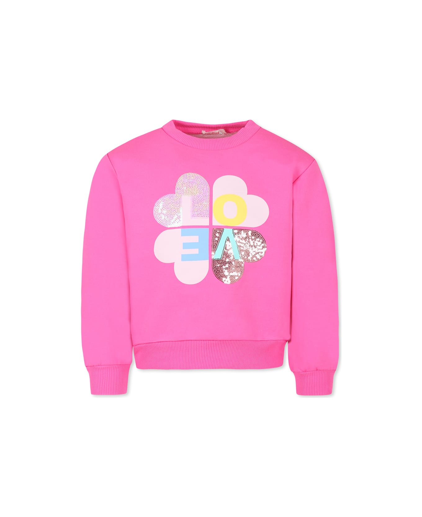 Fuchsia brushed sweatshirt with long sleeves, crew neck, cuffs and hem in ribbed fabric. It is embellished with the writing "Love" hearts and sequins, on the front.