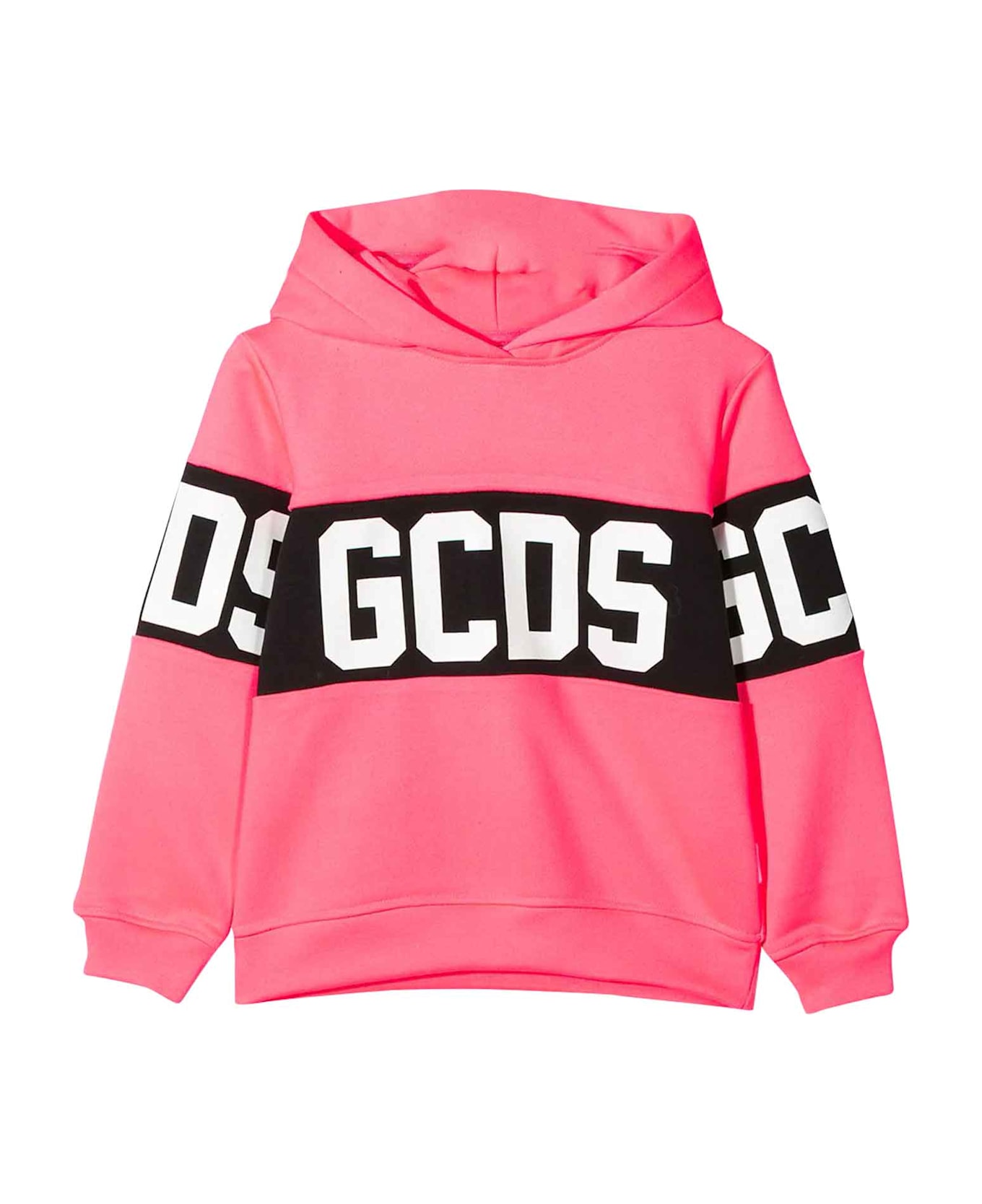 fluo pink sweatshirt with black band on the front with contrasting logo. 100% cotton
