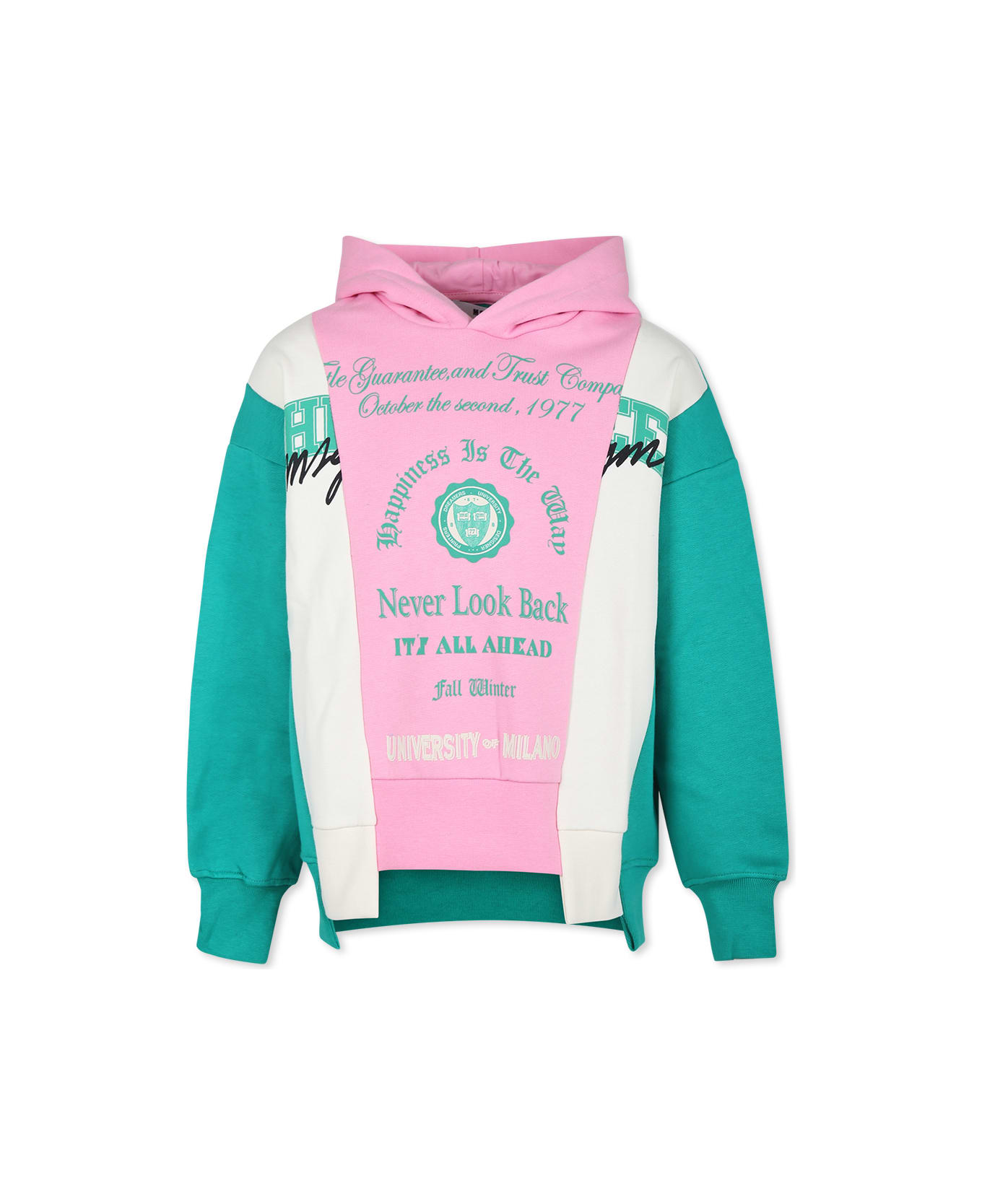 Green sweatshirt in fleece cotton, long sleeves, with hood, ribbed cuffs and asymmetric hem. It is embellished with college style logo print and writing on the front.