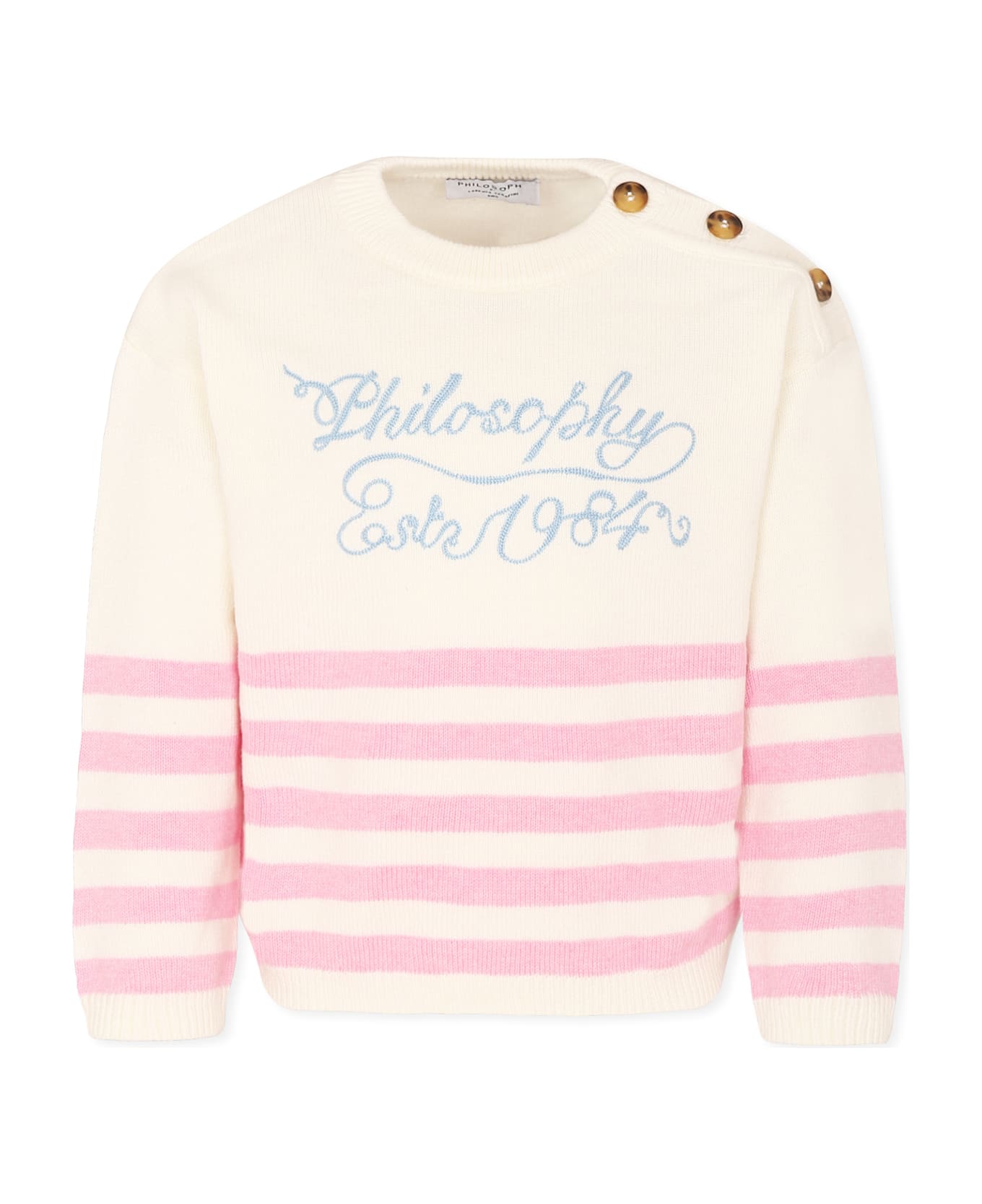 Ivory cotton sweater, long sleeves, with button fastening on the shoulder, ribbed crew neck, cuffs and hem. It is embellished with embroidered logo on the front and pink stripes.